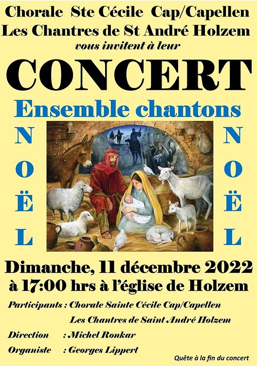 Die Chorale Sainte Cécile Cap/Capellen und die Chantres de Saint Andre Holzem laden herzlichst ein zum Konzert "Ensemble chantons Noël" (lasst uns zusammen zu Weinachten singen) welches am Sonntag dem 11.Dezember um 17 Uhr in der Pfarrkirche in Holzem stattfindet.