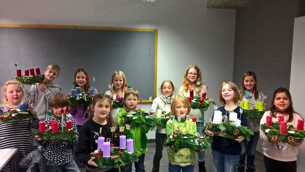 Wie schon viele Jahre zuvor haben auch dieses Mal wieder viele Kinder einen schönen selbst gebastelten Adventskranz mit nach Hause genommen. Es sollten so viel wie möglich Naturmaterialien mit eingearbeitet werden. Denn richtige Fichtenzweige riechen herrlich zur Weihnachtszeit in der Wohnung. Die strahlenden Gesichter zeigen wie viel Spass es gemacht hat.
