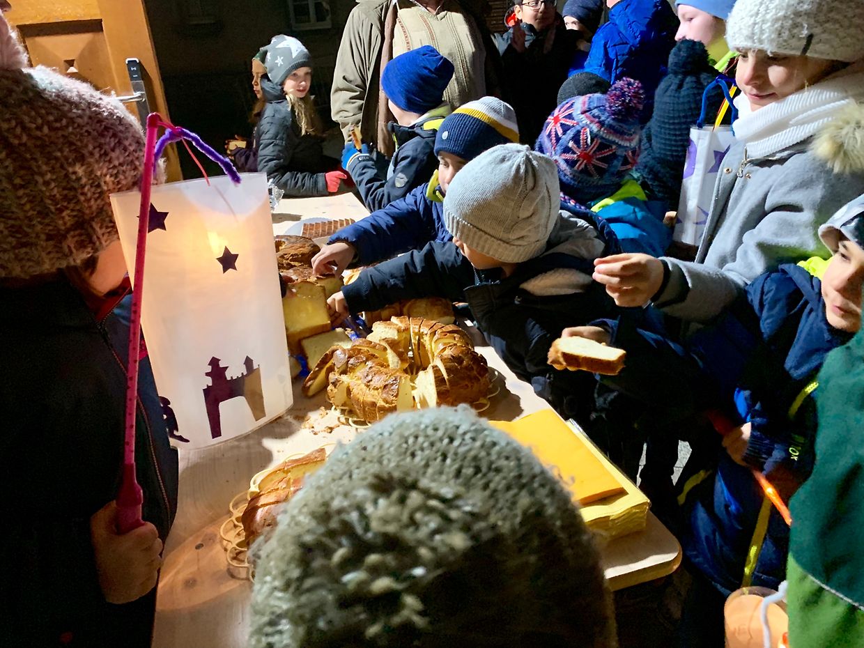 Wieder bei der Kirche angelangt, wird Brot und Kuchen an alle Beteiligten verteilt, alles nach dem Vorbild von St. Martin. Gaby