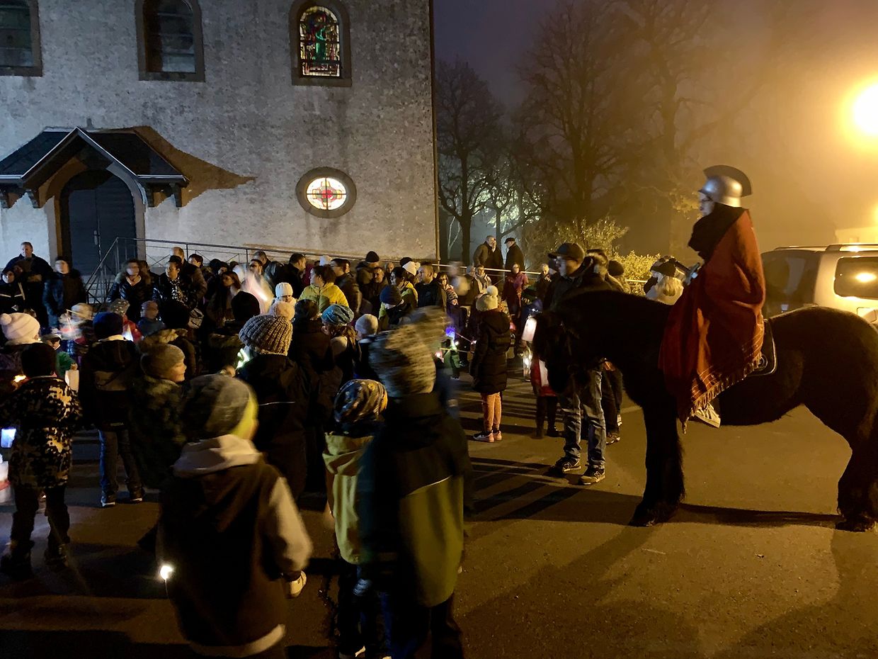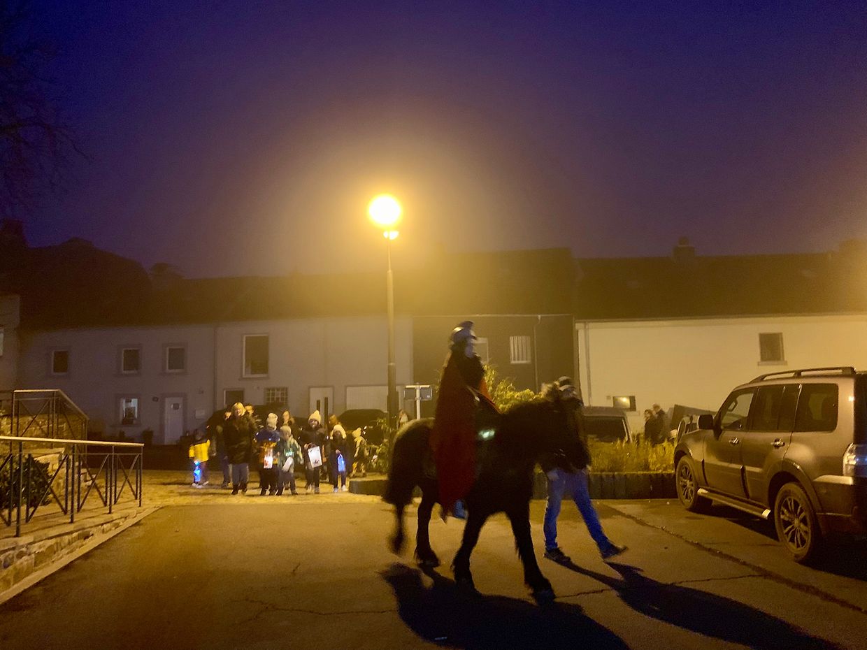 Nach der, von Pfarrer Jeannot Gillen zelebrierten Messe, umrahmt von Nico Walisch am Akkordeon und gesanglich von Sr. Claudine Draut, ziehen die singenden Kinder mit ihren Laternen sowie mit St. Martin, hoch zu Ross an der Spitze des Umzugs, um das Kirchengelände.