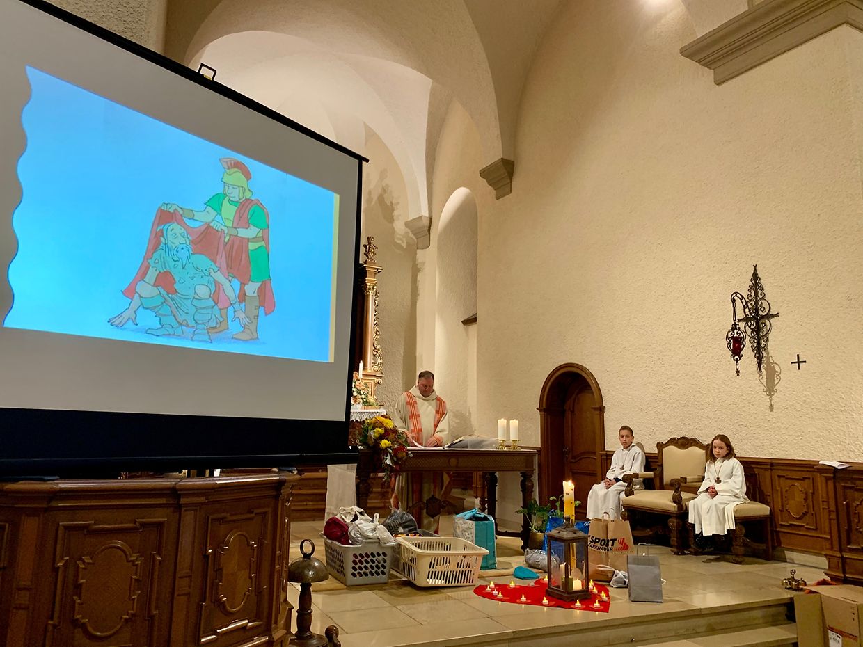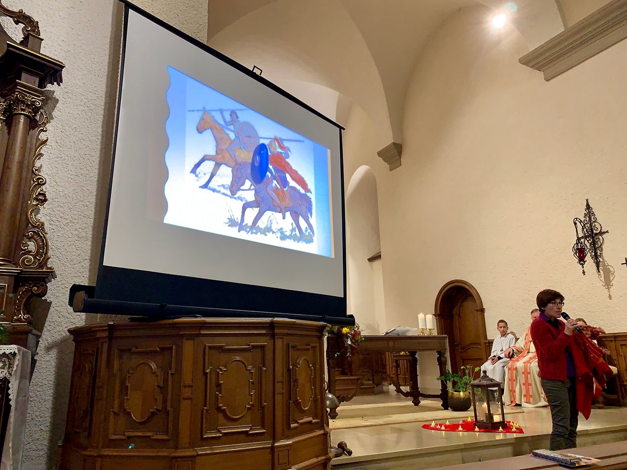 Nach der Begrüßung in der Hosinger Pfarrkirche, erzählte Marie-Anne Kaes, untermalt von einer Bildprojektion sowie einem Frag-und Antwortspiel der Pastoralassistentin Nicole Kleer, die Geschichte des Heiligen Martin von Tours.