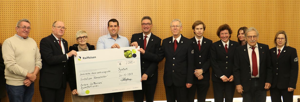 Traditionell hat d'Fanfare Hueschtert op Stiefesdag op hire Concert de Bienfaisance agelueden. An der Hueschterter Kierch huet d'Musek, mam Chef Claude Hoffmann, en ofwiesslungsräiche Programm gespillt, deen d'Sonja Sartorius an de Claude Bache présentéiert hunn. An der Paus huet d'Madame Viviane Vermeer vun der Associatioun Wonschstär e puer Wuert un d'Leit geriicht. Nom Concert haat Gemeng Nidderaawen op en Éierepatt invitéiert. Do gouf dann och de Chèque, a Präsenz vum Buergermeeschter Fréd Ternes, vum Vize-Präsident Claude Bache un d'Madame Vermeer iwwerreecht.
