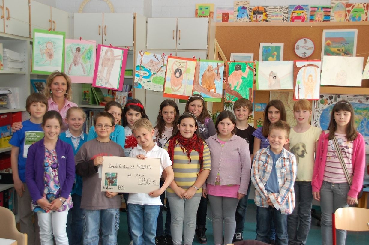 Die Schulkinder der Klasse 3.2. aus der Primärschule Howald haben unter der Leitung ihrer Lehrerin, Frau Patricia WEITZ, eine besondere Osteraktion auf die Beine gestellt. Sie haben 300 Eier gekocht, gefärbt und dann verkauft. Den stolzen Erlös von 350 € haben sie am 29.04.2011 an BOS-Luxembourg a.s.b.l. gespendet. Sie helfen damit die Orang-Utans und den Regenwald auf Borneo (Indonesien) zu schützen.
