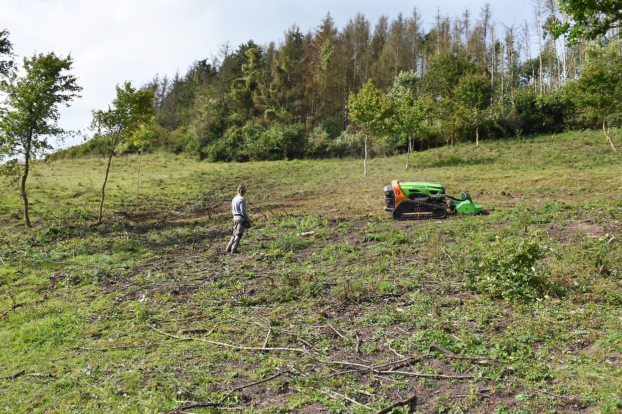 Um dem entgegenzuwirken und die verbuschten Bestände wieder freizustellen, sind Entbuschungsmaßnahmen von großer Bedeutung. Dadurch werden wertvolle Halbtrockenrasen wiederhergestellt. So auch auf der Fläche zwischen Lorentzweiler „a Romescht“ und Steinsel „Zapp“, wo sich noch zahlreiche kleinere Halbtrockenrasen-Bestände finden. Die hier vorgestellte, ehemals verbuschte Fläche wurde Anfang des Jahres in zwei Etappen entbuscht. Zur Nachpflege wird u.a. ein Raupenmäher, der besonders für das Gelände geeignet ist, genutzt. Auf der so wieder aufgelichteten Fläche können sich die typischen Pflanzenarten auf natürliche Weise aus der Samenbank im Boden entwickeln, sodass sich in ein paar Jahren der Artenreichtum mit Hilfe einer extensiven Beweidung wieder entfalten kann.