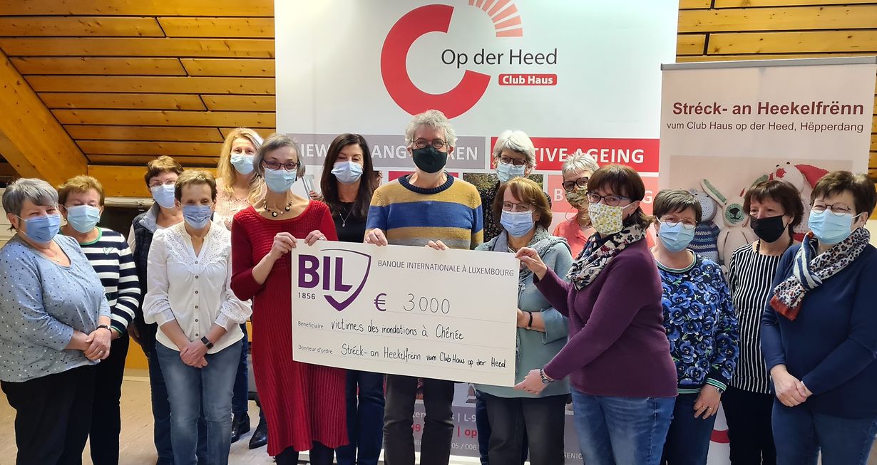 Le chèque a été remis à Josée et Johan en présence des bénévoles, des responsables du Stréck- an Häkelgrupp Jeanny Hentz et Christiane Meyer et de la chargée de direction du Club Haus op der Heed afin d'aider les habitants de Chênée.