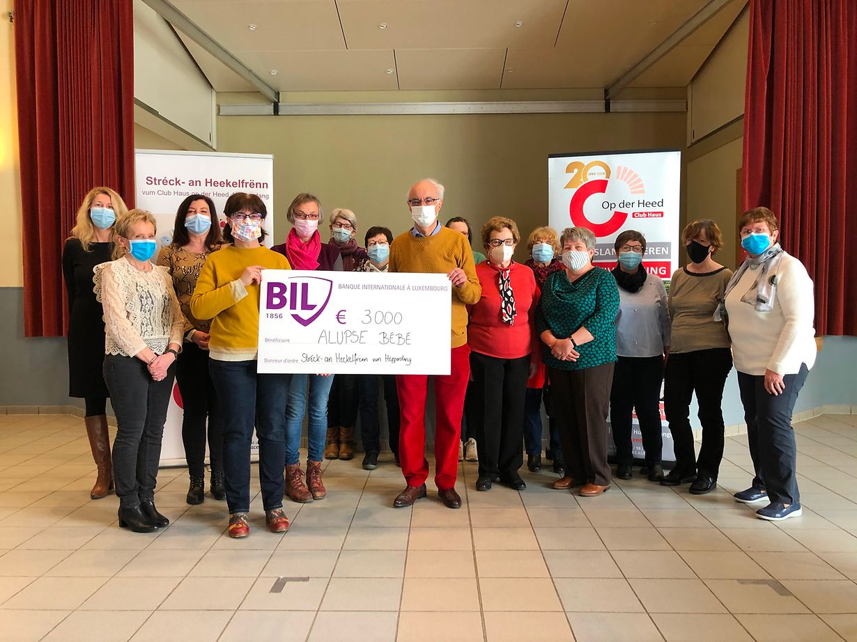 No engem flotten Austausch an interessanten Erklärungen iwwert d‘Associatioun Alupse, gouf de Scheck, an Presenz vun den Benevollen an hiren Leederinnen Jeanny Hentz an Christiane Meyer souwéi der Chargée de direction vum Club Haus op der Heed Tania Draut, un den Dr Seligmann, President vun Alupse, iwwerreecht.