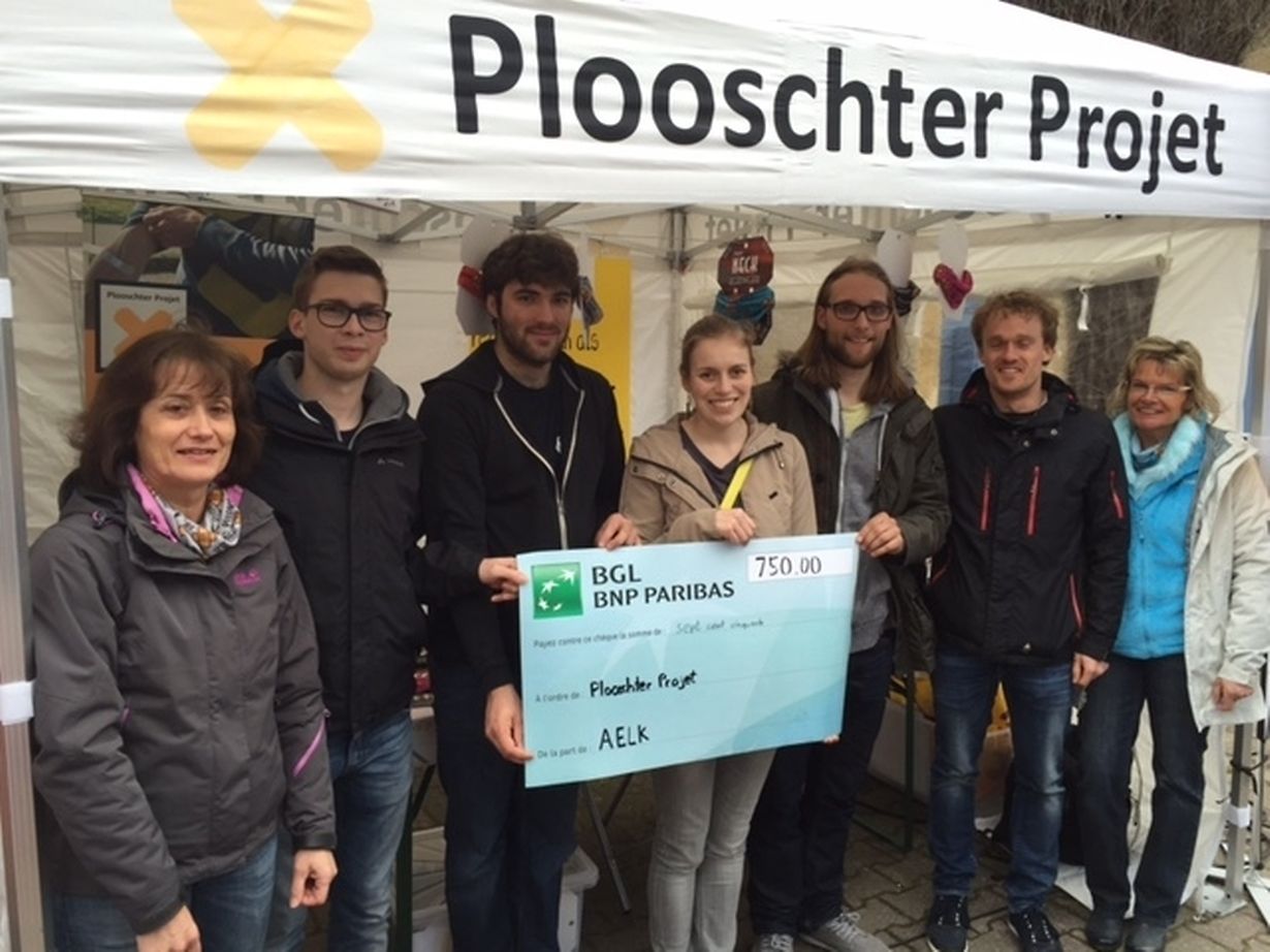 E Samschden, de 16. Abrëll hunn zu Izeg eng Handvoll Membere vum Karlsruher Studentencercel AELK (www.aelk.lu) e Scheck vun 750€ dem ‘Plooschter Projet’ iwwerreecht. Wéi all Joer ass e Grupp sportlecher Karlsruher Studenten am Juli lescht Joer de ronn 230km-wäite Wee vu Karlsruhe op Lëtzebuerg mam Vëlo gefuer. Des Aktivitéit stoung wéi gewinnt am Liicht vun engem gudden Zweck an sou goufen dës Kéier Sue fir de ‘Plooschter Projet’ (plooschterprojet.wordpress.com) gesammelt.