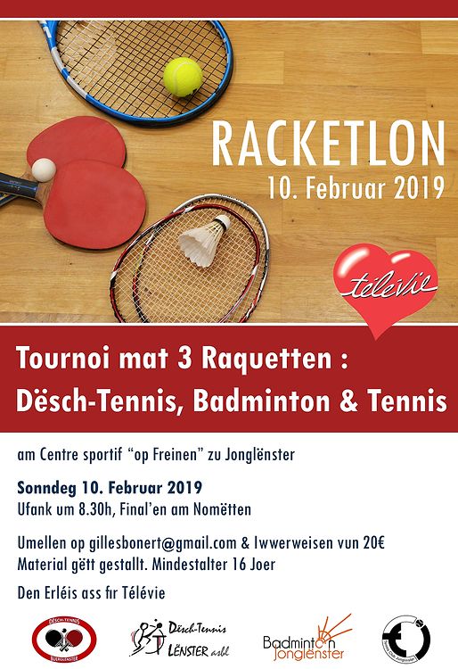 De Sonden 10. Februar 2019 organiséieren den Tennis Club Jonglënster, den Dësch-Tennis Lënster, den Dësch-Tennis Buerglënster an de Badminton Club Jonglënster ee Racketlon Tournoi. Gespillt gëtt een Tournoi an den 3 Disziplinne : Dësch-Tennis, Badminton an Tennis.