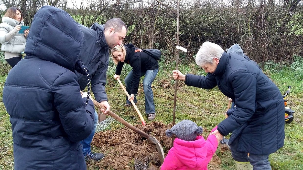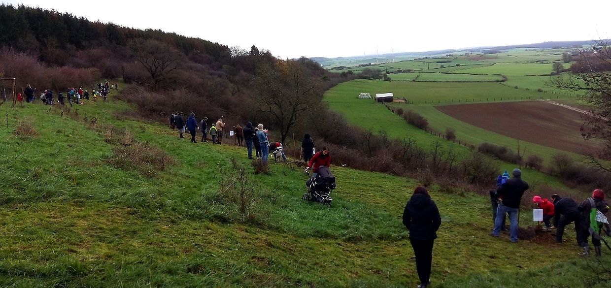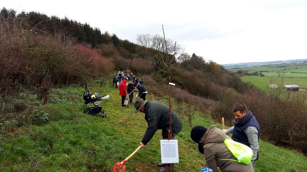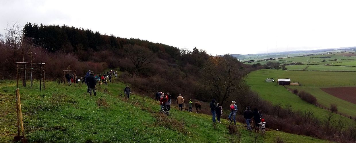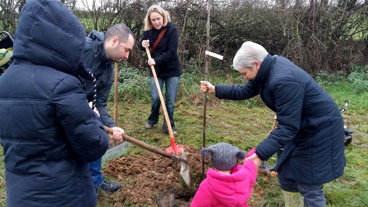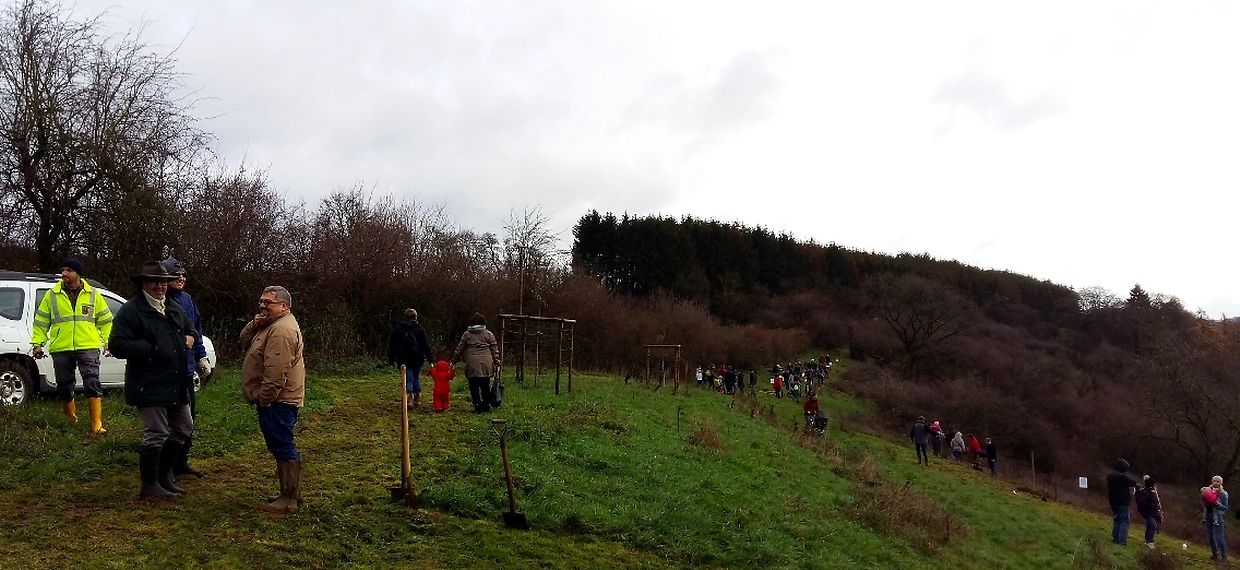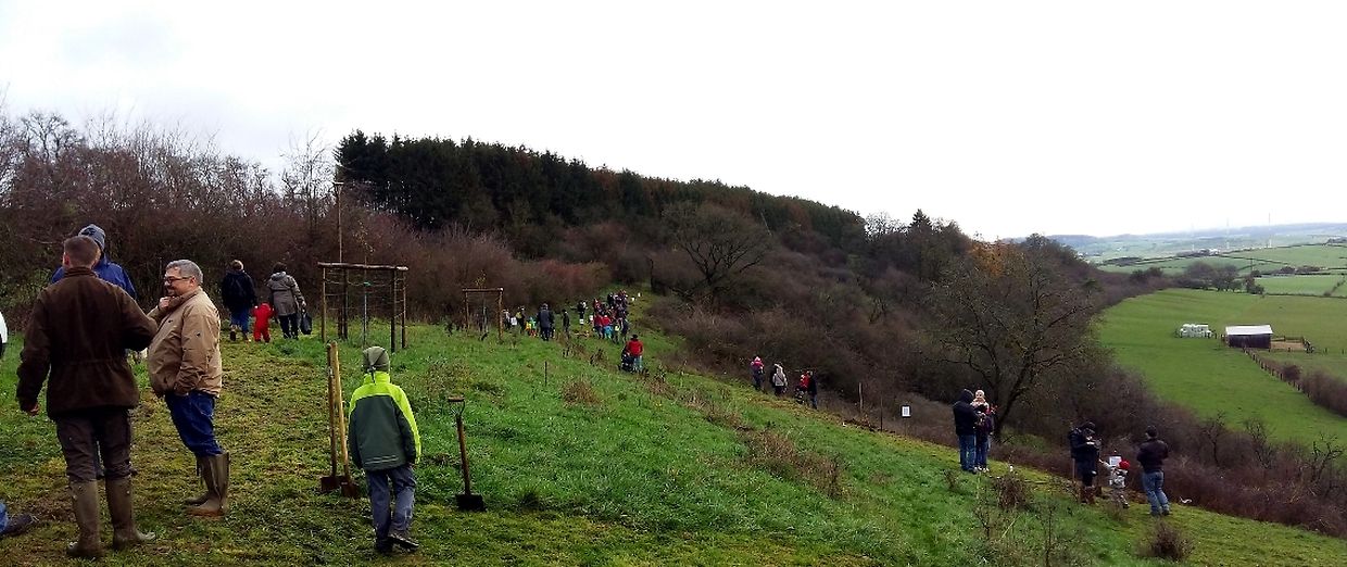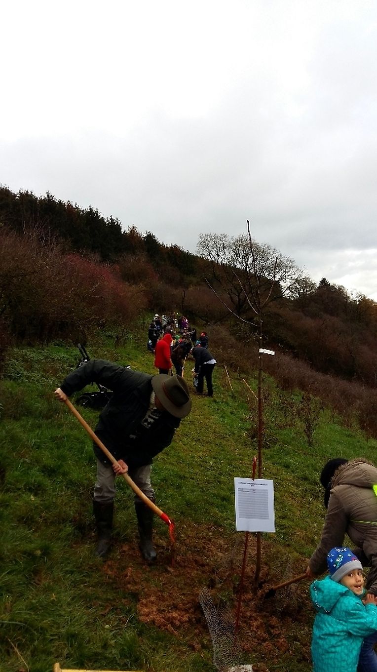 Gëschter hate mir bei äis zu Jonglënster eis traditionell Bamplanzaktioun fir déi Neigebueren 2014 aus eiser Gemeng. D'lescht Joer sinn 79 Kanner bei äis gebuer ginn. Et war e flotte Moie bei guddem Wieder, an op d'Invitatioun vu Gemeng an Ëmweltkommissioun ware mir zu ronn 90 (Elteren, Grousselteren, Kanner, ...) fir an eisem Bongert um 'Duelebierg' 12 Äppel- a Quetschebeem ze planzen. Op dëser Plaz si mir elo schonn zënter 2011 an elo sti 60 Uebstbeem hei. E flotte Bongert op enger flotter Plaz. Hei kënnen dann d’Kanner spéiderhin hiert eegent Uebst plécke kommen.