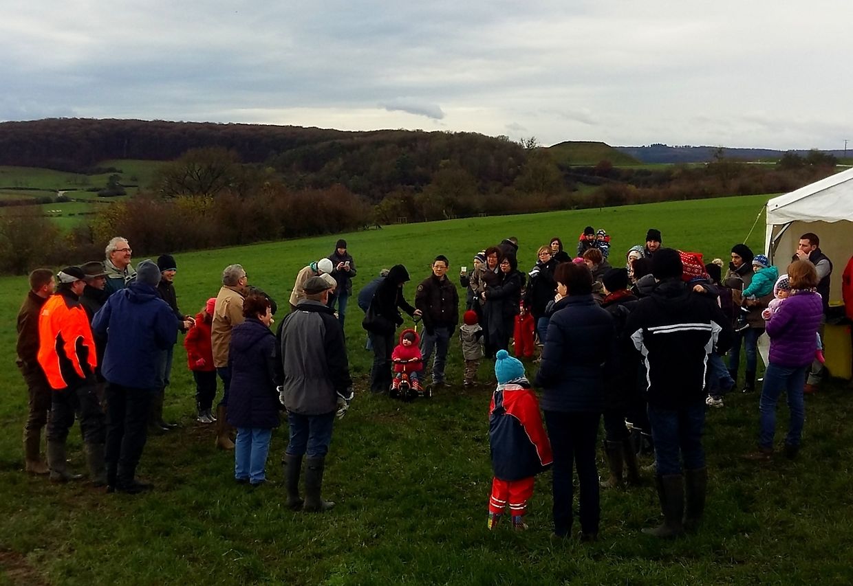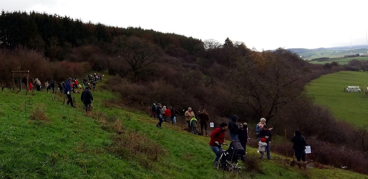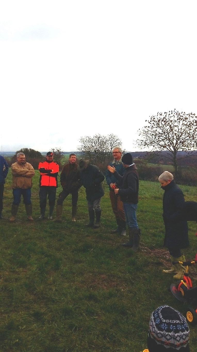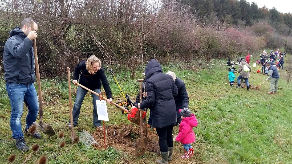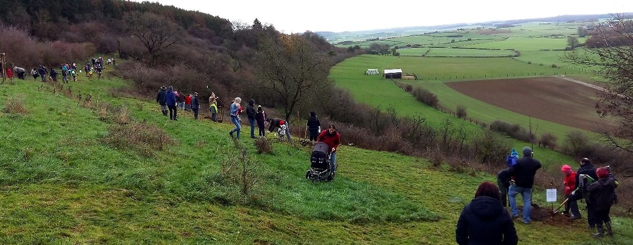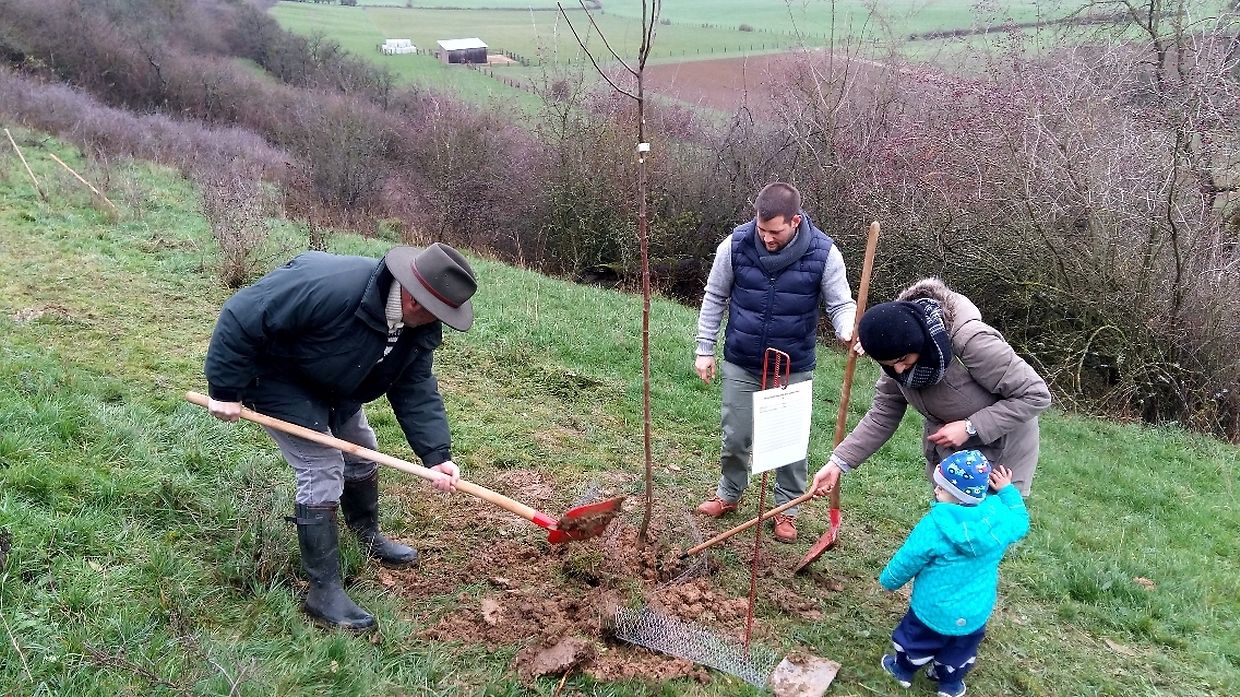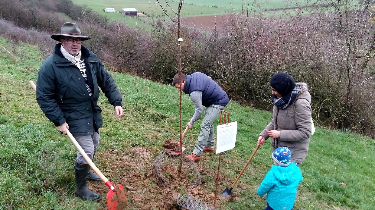 Gëschter hate mir bei äis zu Jonglënster eis traditionell Bamplanzaktioun fir déi Neigebueren 2014 aus eiser Gemeng. D'lescht Joer sinn 79 Kanner bei äis gebuer ginn. Et war e flotte Moie bei guddem Wieder, an op d'Invitatioun vu Gemeng an Ëmweltkommissioun ware mir zu ronn 90 (Elteren, Grousselteren, Kanner, ...) fir an eisem Bongert um 'Duelebierg' 12 Äppel- a Quetschebeem ze planzen. Op dëser Plaz si mir elo schonn zënter 2011 an elo sti 60 Uebstbeem hei. E flotte Bongert op enger flotter Plaz. Hei kënnen dann d’Kanner spéiderhin hiert eegent Uebst plécke kommen.