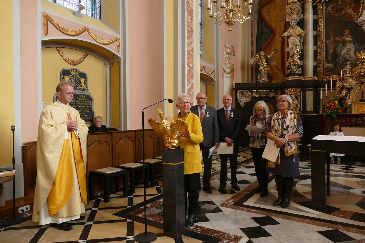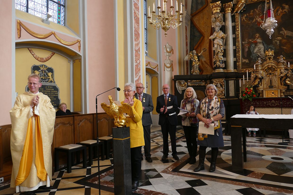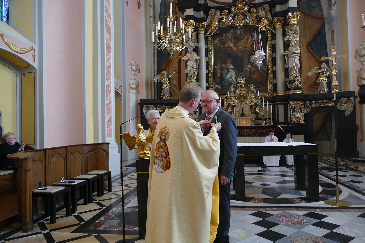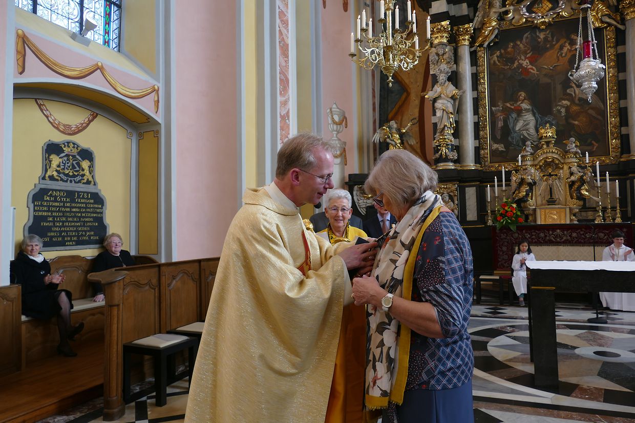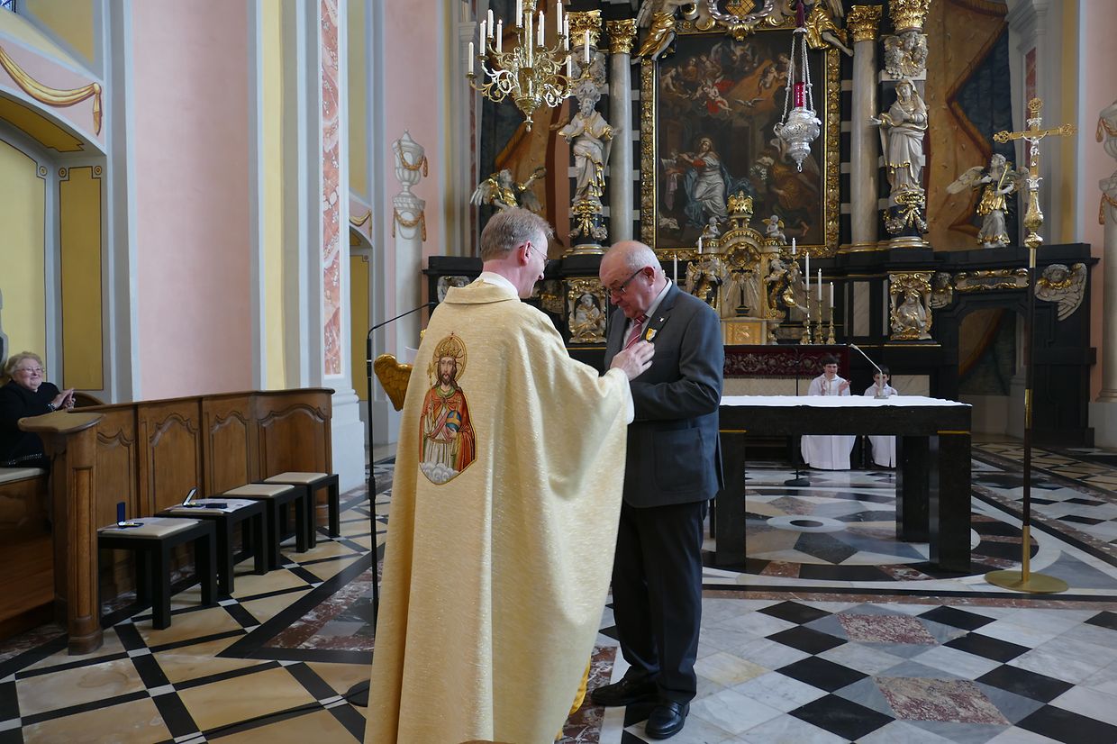 Am Kader vun dëser Feier hunn de Paschtouer Francis Erasmy an d’Presidentin Ferny Wagener-Wecker dem aktive Sänger Jean-Pierre Hinkel - dee schon zënter 1979 am Lënster Gesank ass – d’Goldmedaille mat Palmetten fir 40 Jar aktiven Déngscht an der Kierch iwwerreecht. Den Aloyse Wilmes krut d’gëlle Pius-Medaille fir eng 30-järeg Memberschaft. Déi sëlwer Pius-Medaille kruten d’Denise Weis-Hoffmann an d’Camille Débické, well si schon 20 Jar Member vum Piusverband sinn. De Paschtouer an d’Presidentin hunn de Geéierten hir laangjäreg Verdéngschter hervirgestrach, wou si sech engagéiert hunn zur Eier vun eiser Härgott an zur Freed vun hire Matmënschen. Och hu si de Membre vun der Chorale an der Musek e grousse Merci ausgesprach fir all dat, wat si fir d’Leit aus der Gemeng leeschten, well se jo hir frou Fester verschéineren an de traureg Momenter méi liicht maachen.