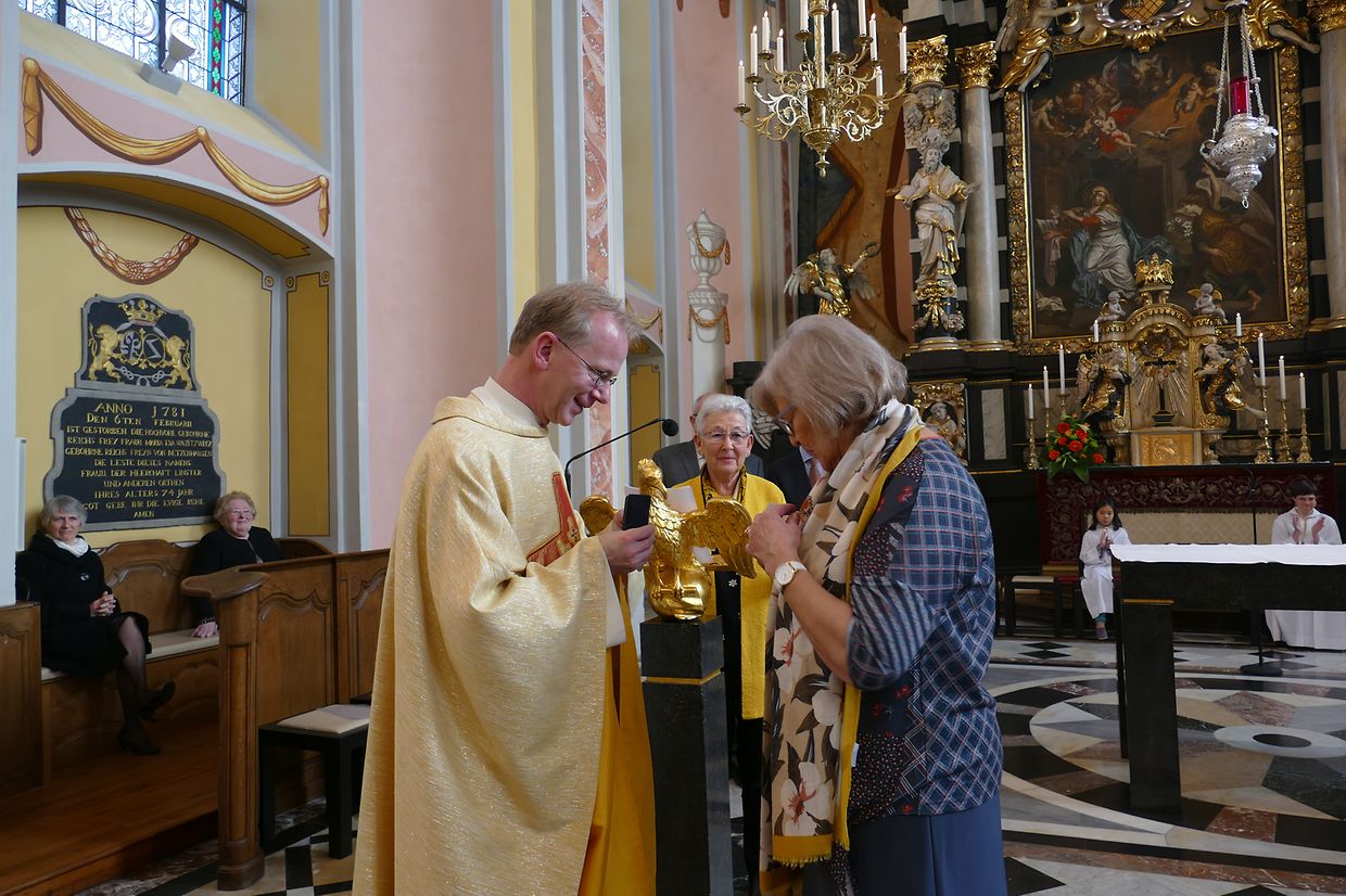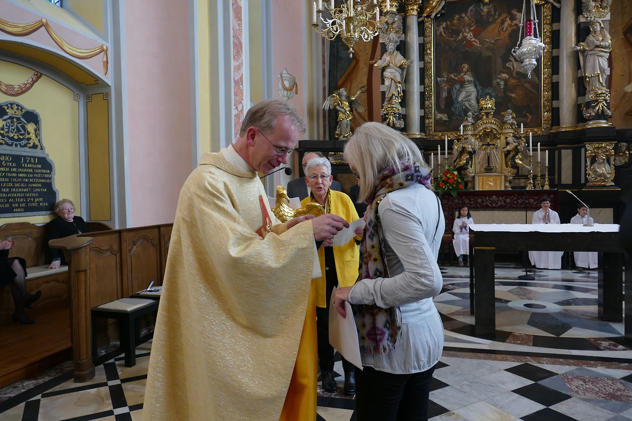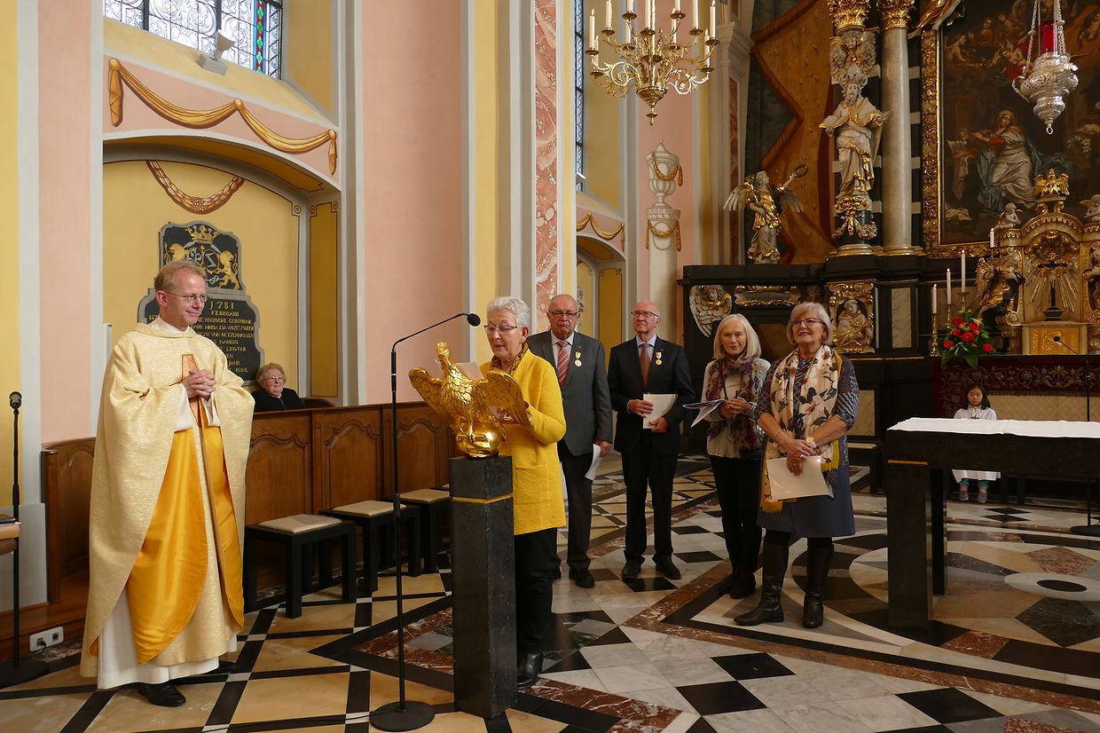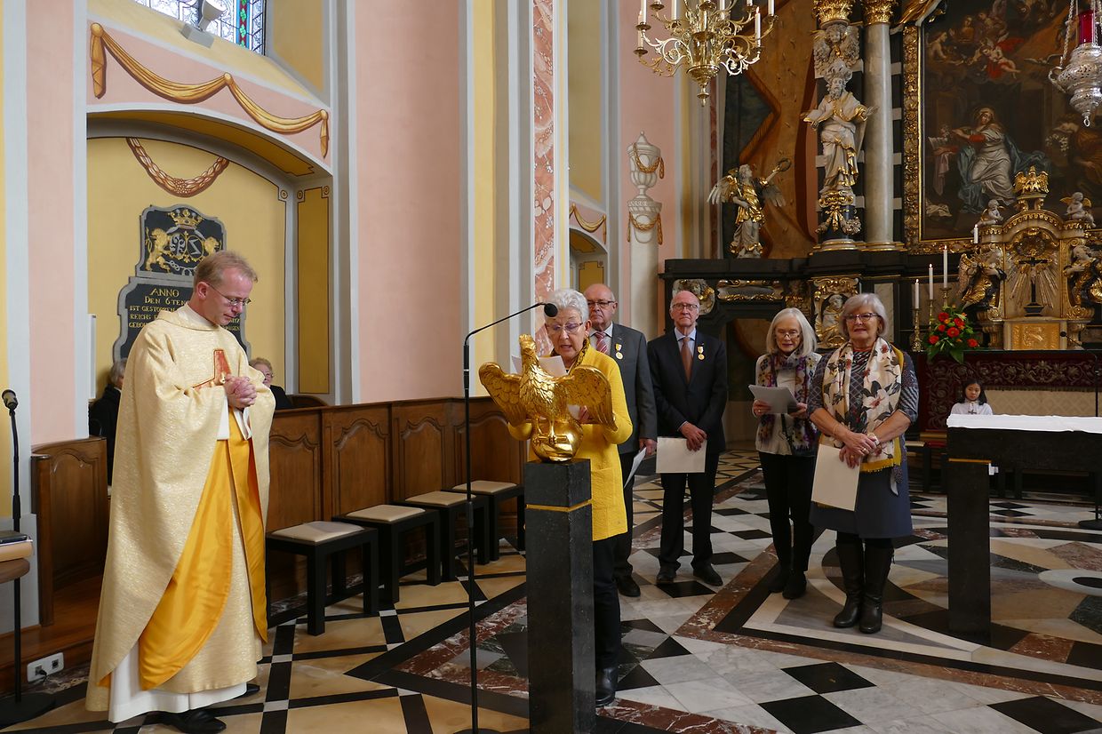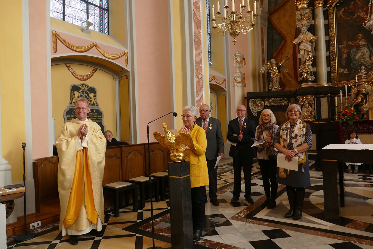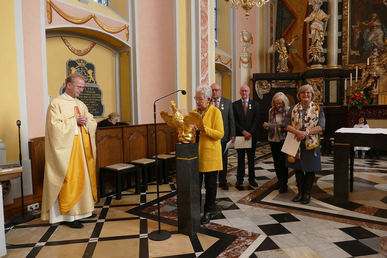 Am Kader vun dëser Feier hunn de Paschtouer Francis Erasmy an d’Presidentin Ferny Wagener-Wecker dem aktive Sänger Jean-Pierre Hinkel - dee schon zënter 1979 am Lënster Gesank ass – d’Goldmedaille mat Palmetten fir 40 Jar aktiven Déngscht an der Kierch iwwerreecht. Den Aloyse Wilmes krut d’gëlle Pius-Medaille fir eng 30-järeg Memberschaft. Déi sëlwer Pius-Medaille kruten d’Denise Weis-Hoffmann an d’Camille Débické, well si schon 20 Jar Member vum Piusverband sinn. De Paschtouer an d’Presidentin hunn de Geéierten hir laangjäreg Verdéngschter hervirgestrach, wou si sech engagéiert hunn zur Eier vun eiser Härgott an zur Freed vun hire Matmënschen. Och hu si de Membre vun der Chorale an der Musek e grousse Merci ausgesprach fir all dat, wat si fir d’Leit aus der Gemeng leeschten, well se jo hir frou Fester verschéineren an de traureg Momenter méi liicht maachen.