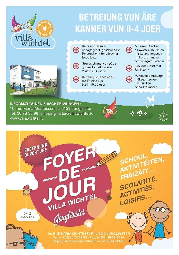 Retrouvez la Crèche & Foyer de Jour Villa Wichtel Junglinster dans la brochure relative de cet évènement multiculturel. (Vous pouvez la demander directement à la Commune de Junglinster)