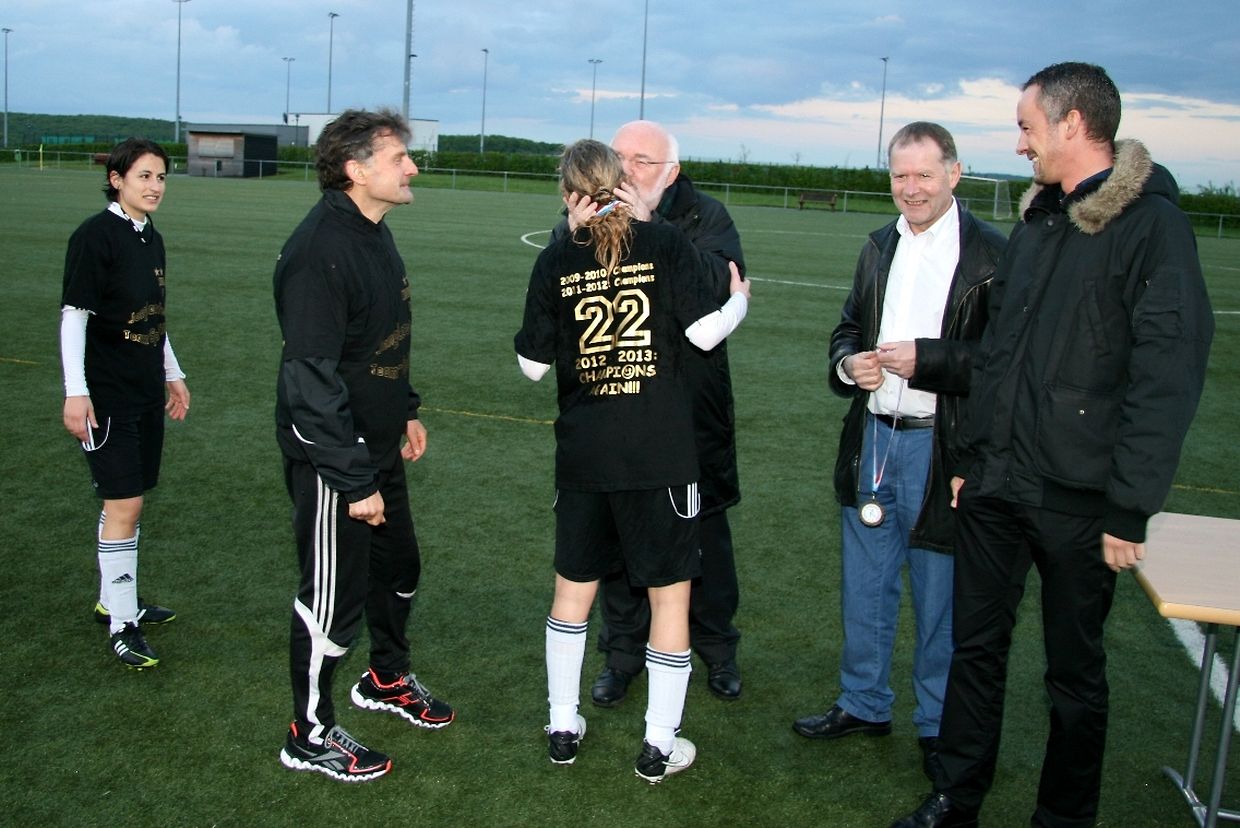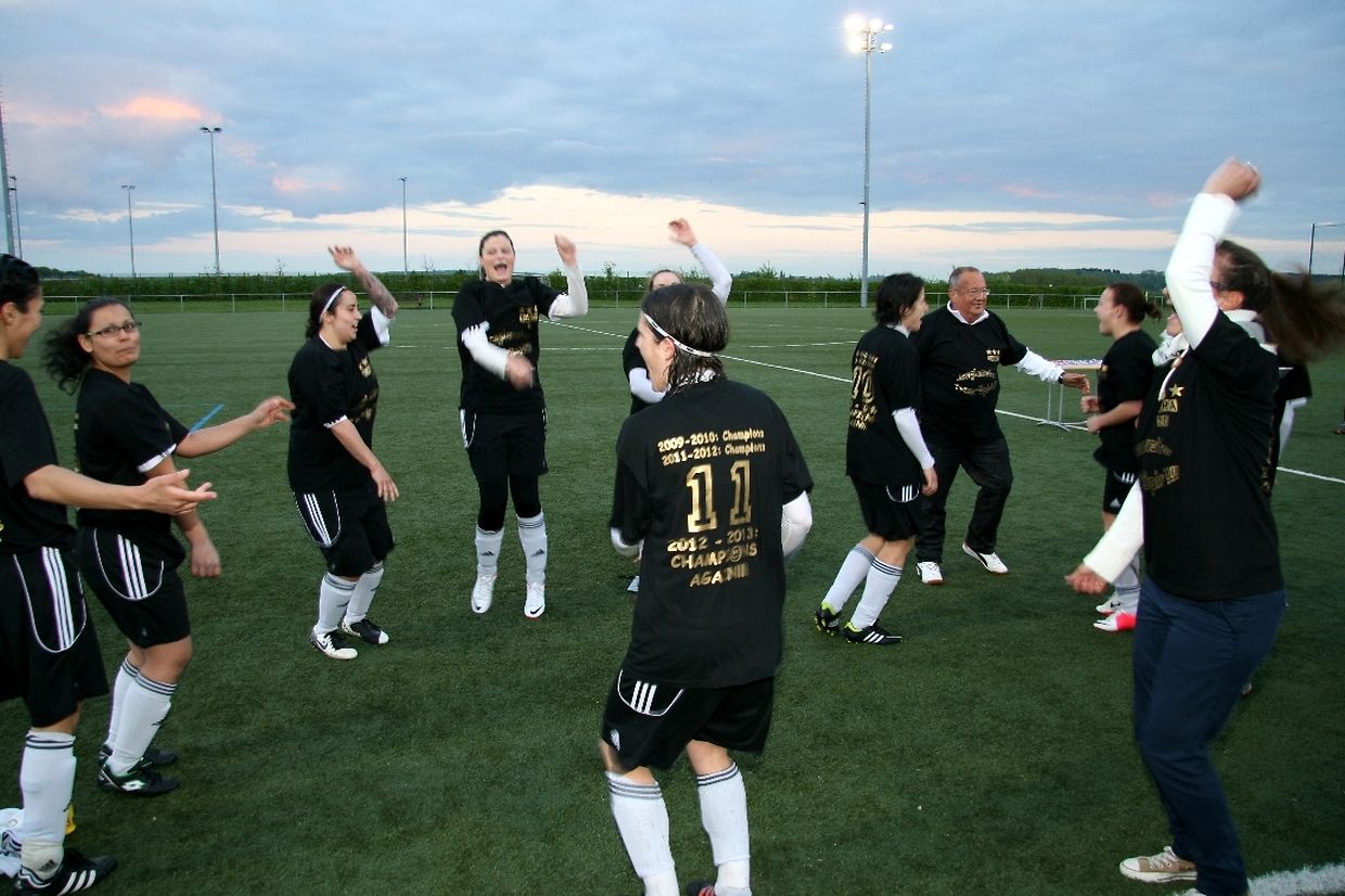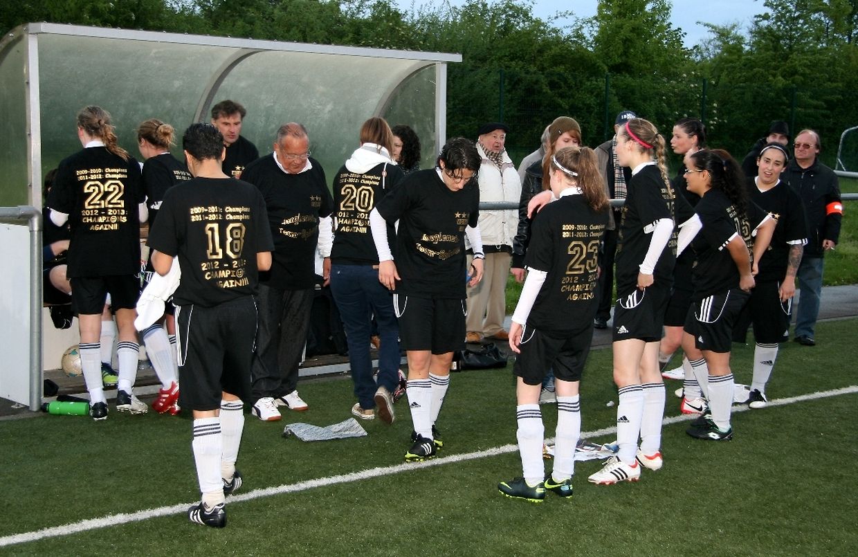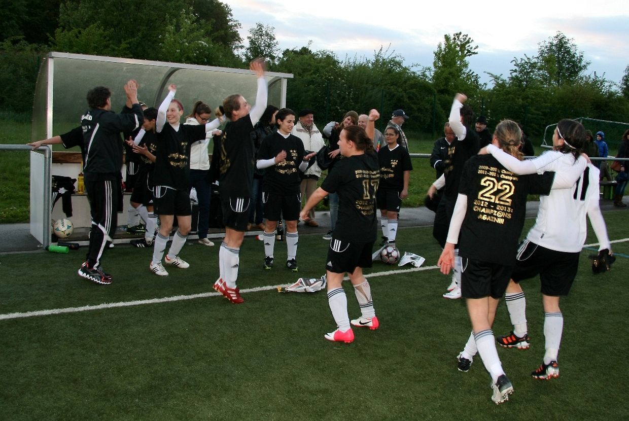 Mat de Spillerinnen hu sech all hir Frënn - a besonnësch hiren treiste Supporter, den Armand Roller - immens gefreet. Et ass nëmmen normal, datt duerno esou richteg vun de Splllerinnen, hirem Trainer Calo Calmes, hirem Masseur Wolfgang Berwanger, hire Frënn a Supportere gefeiert ginn ass. Elo feelt nach en Erfolleg an der Coupe-Finale an den Doublé 2013 ass perfekt. Mir drécken de Spillerinnen an dem ganzen Team d'Daimercher ganz fest! (dd)