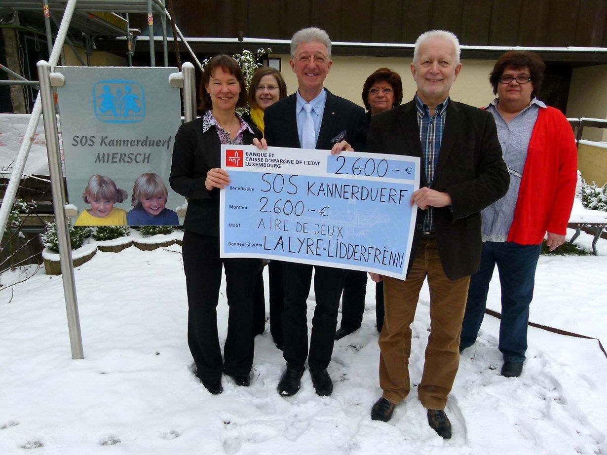 De Mandolineveräin "La Lyre vu Guedber an d'Chorale "Lidderfrënn" vu Monnerech hate sech zesumme gedoen, fir zwéi Benefiz-Concerten viru Chrëschtdag ze spillen respektiv ze sangen. Den 8. Dezember si si zu Biergem opgetrueden an den 23. Dezember an der Kierch zu Guedber. Haut de Muerge war eng Delegatioun vun dienen zwéi Veräiner mat der Presidentin Isabelle Merlevede (La Lyre) a mat hirem President Jeannot Clement (Lidderfrënn) op Miersch an d' SOS-Kannerduerf, wo si dem Direkter Régis Thill den Erléis vun de Concerten a Form vun engem Scheck vun 2.600 Euro iwwerécht hunn. D'Isabelle Merlevede huet sech an hirer Usprooch e.a. mat dëse Wierder un den Direkter an un d'aktiv Membre geriicht: "Merci un Iech, datt mir als zwéi kulturell Veräiner eis konnten asetzen fir der Fondatioun SOS-Kannerduerf Miersch e bëssen ze hëllefen an dass mir mat oppenen Äerem hei am Haus empfaange gi sinn. Merci och all eisen aktive Musikantinnen a Musikanten an all eise Sängerinnen a Sänger fir hire groussen Asaz an déi zwéi schéi Concerten, déi si zesumme gspillt a gesongen hunn. Eis Dankbarkeet ass ëmsou méi grouss, well mir äre groussen Asaz, är Motivatioun an är virbildlech Aarbecht am Intérêt vun äre Kanner ze schätze wëssen a mir d'Gleeënheet kruten, fir iech op dës Aart a Weis z'ënnerstëtzen." De Régis Thill huet deenen zwéi Veräiner en décke Merci ausgeschwat fir dee schéine Geste vu Generositéit. Duerno huet hien den Delegatiounen d'Kannerduerf gewisen an all ware si begeeschtert vun deer gudder Aarbecht, déi do geleescht gëtt. (dd)