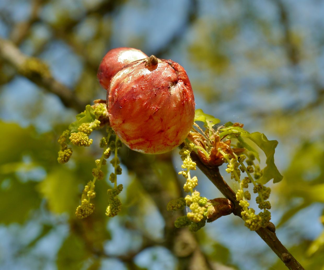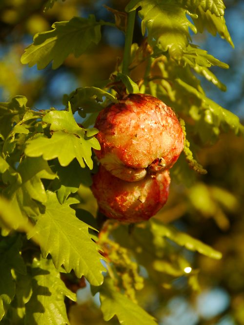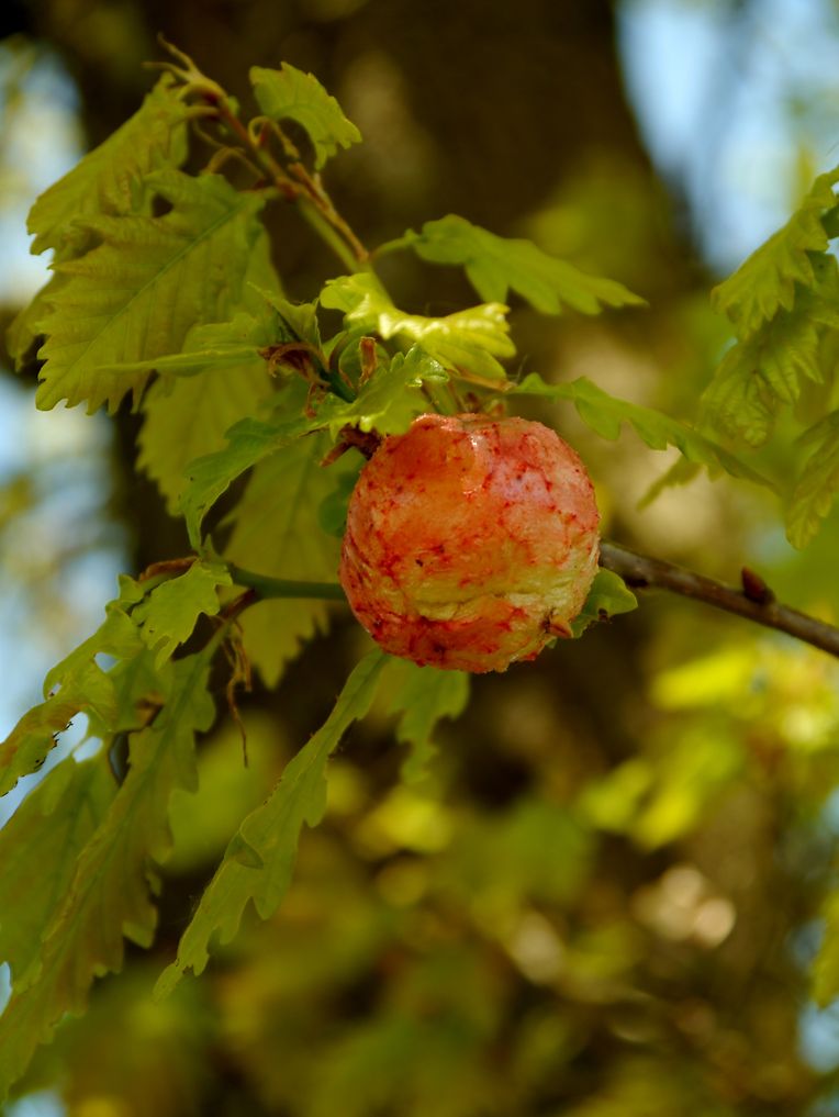 Ech hunn net schlecht gestaunt, wéi ech des Friichten un enger aaler Eech gesinn hunn. Ech hunn mech dunn schlau gemach bei Google an hei as d'Erklärung vun Wikipedia: "Der rundliche Gallapfel, auch Eichengalle und Eichengallapfel genannt, ist eine Pflanzengalle, die im Herbst an der Unterseite von Eichenblättern, insbesondere von Quercus infectoria Olivier, vorkommt. Er entsteht durch abgelegte befruchtete Eier der Gemeinen Eichengallwespe (Cynips quercusfolii).