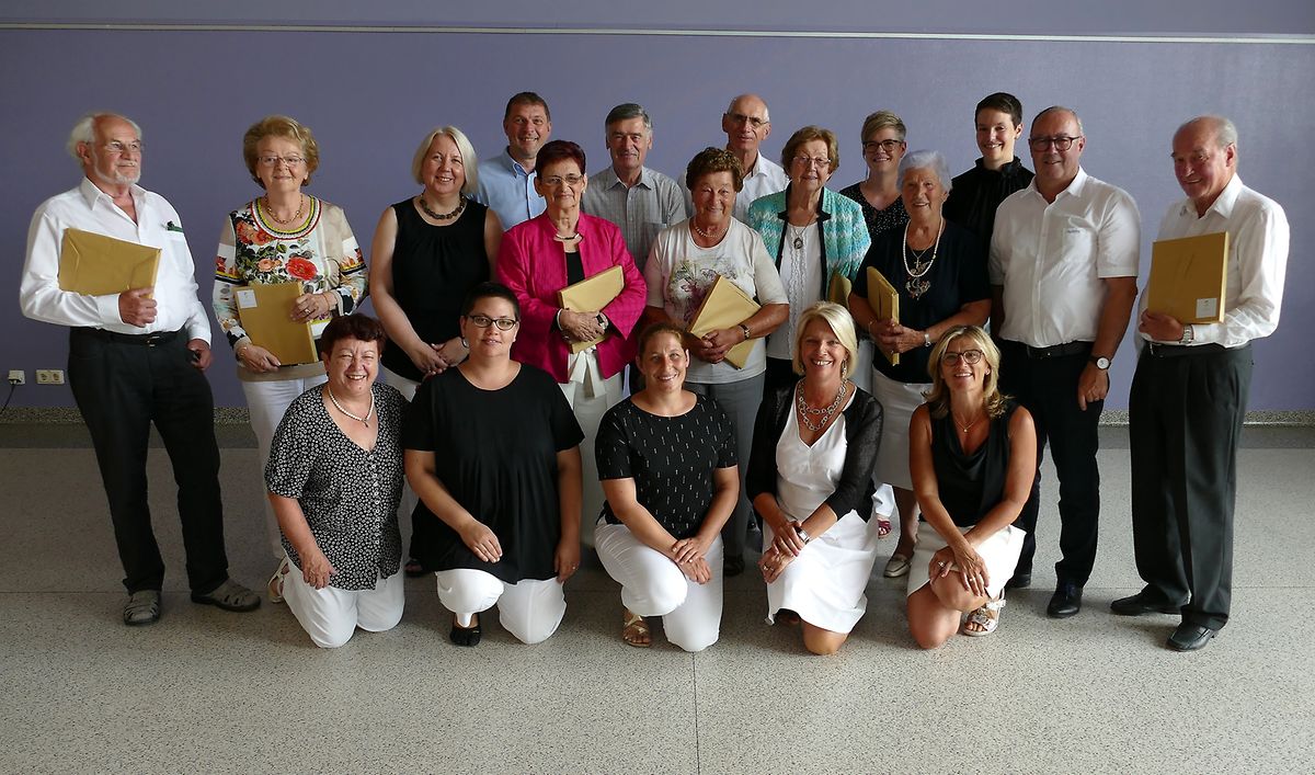 Der zur Tradition gewordene « Seniorendag » in der Gemeinde Junglinster hatte auch dieses Jahr einen großen Erfolg zu verzeichnen. Bürgermeister Romain Reitz und die Präsidentin der Seniorenkommission, Mireille Hinkel-Tadaszak, zeigten sich in ihren Ansprachen erfreut, rund 120 Senioren – davon eine Reihe von Bewohnern des CIPA Jonglënster - begrüßen zu können. Das Mittagessen - zubereitet vom Restaurant Le Gourmet - schmeckte allen Teilnehmern ausgezeichnet wie auch die Torten, die von Gilbert Kapp geliefert wurden. Während des Mittagessens unterhielt das « Ensemble Blue Stars » die Senioren mit bekannten Melodien. Anschließend führten der Tanzvereien « Dillendapp » und die « Jazz-Dance-Gruppe » vom « Fitness-Club Jonglënster » Tänze auf, die das Publikum begeisterten. Die Sozialschöffin Françoise Hetto-Gaasch blickte auf die vergangenen 80 Jahre zurück ehe sie mit Bürgermeister Romain Reitz den folgenden anwesenden Jubilaren, die dieses Jahr ihren 80. Geburtstag feiern, als Geschenk das Buch « Wenn Steine reden » über die Geschichte der Gemeinde Junglinster, das kürzlich herausgegeben wurde, überreichte : Evert Appel, Margot Degraux-Eiffes, Fernande Dimmer-Hein, Hilda Hansen-Wagner, Henriette Hellers-Flies, Lucien Mackel, Flory Rischette, Charlotte Erpelding-Sauber und Marcelle Wecker-Buchholtz (vertreten durch ihre Enkelin).
