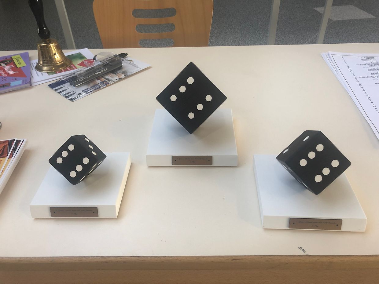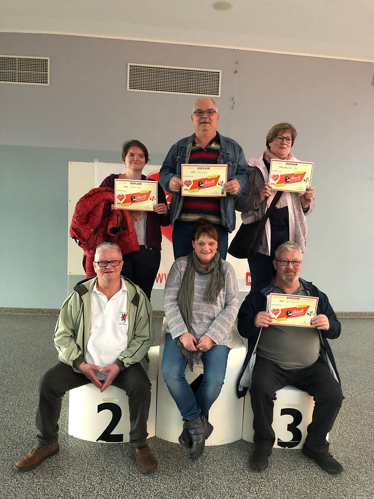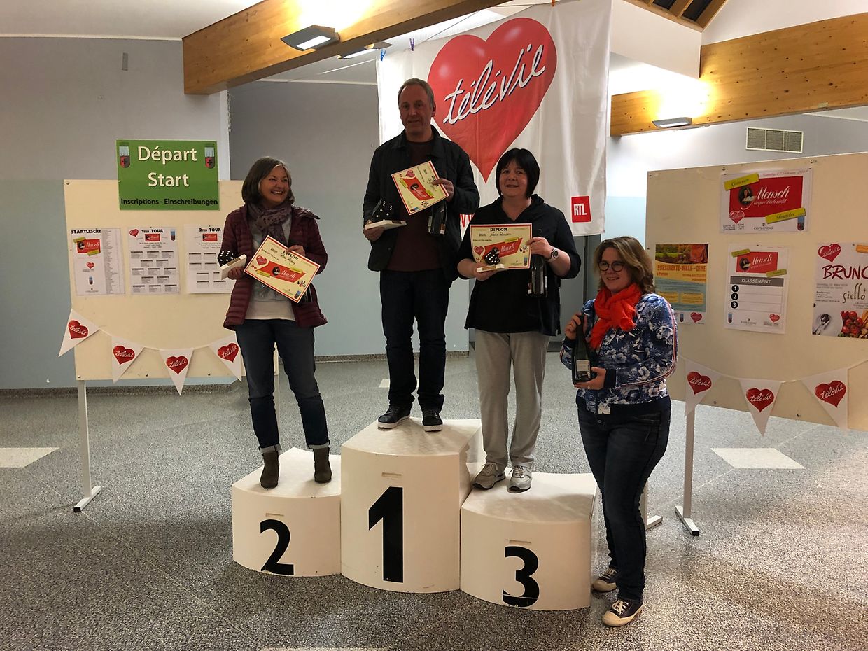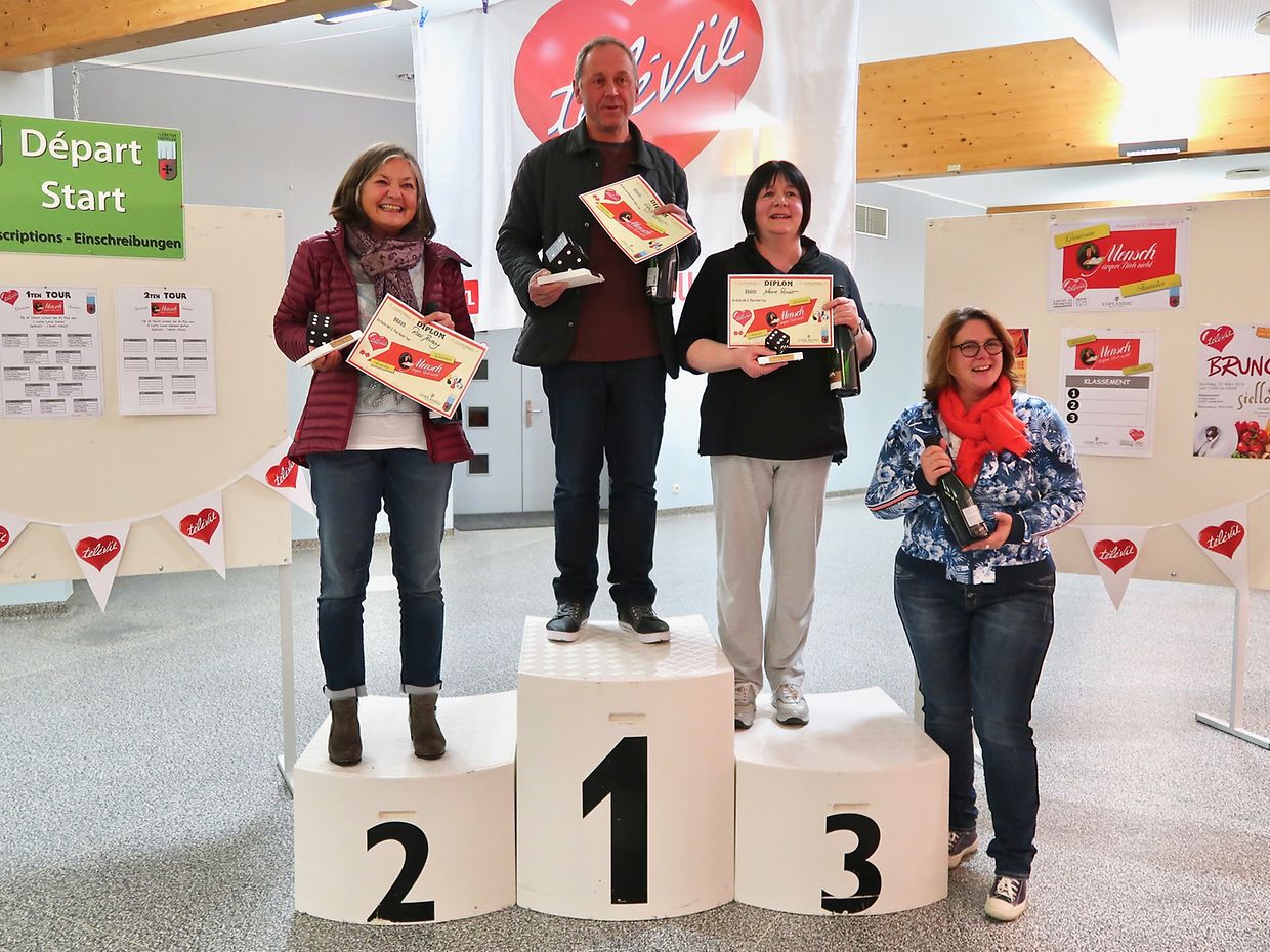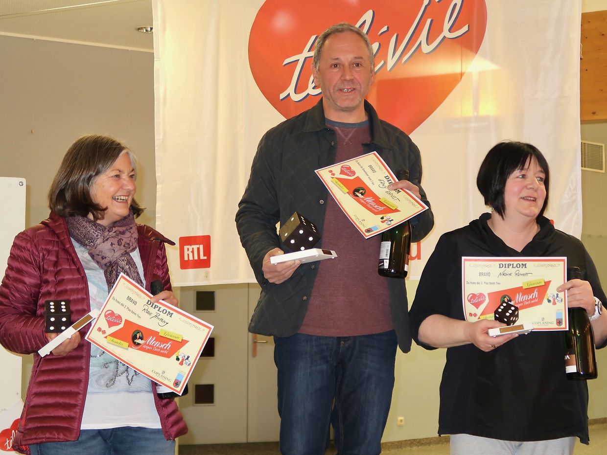 Die Lënster Trëppler organisierten erstmals ein offizielles MENSCH ÄRGERE DICH NICHT Turnier im Centre Polyvalent Gaston Stein in Junglinster. 52 Spieler nahmen an dieser Erstausgabe teil und hatten mächtig Spass. An Vierertischen ging eine erste Runde über 40 Minuten schnell vorbei und der/die letztplatzierte schied auch schon aus. Nach der nächsten Runde an 10 Tischen, schied wieder der/die 4.Platzierte aus. Die beiden letzten an den Tischen der nächsten Runde waren zum aufhören gezwungen während danach nur noch die 4 Erstplatzierten das Grosse Finale spielen konnten. Unter grossem Publikumsbeifall, Ermunterungszurufen und Applaus stand der Gewinner nach fast 50 Minuten und einem nervenaufreibendem Spiel fest : Erny Ernst. Die Ehrenplätze wurden vergeben an Rose Antony (2.), die das Glück hatte die erste Runde als "Lucky Loser" zu überstehen. 3te wurde Nadine Reinert, derweil Patricia Petruccioli als 4te leider keinen Platz mehr auf dem Podium bekam. Wunderschöne "Würfel-Pokale" von Armand Schleich gefertigt belohnten die Gewinner. Es sei hervorgehoben dass die Originalspiele von Coplaning gesponsort wurden und der Gesamterlös an Télévie gespendet wurde.