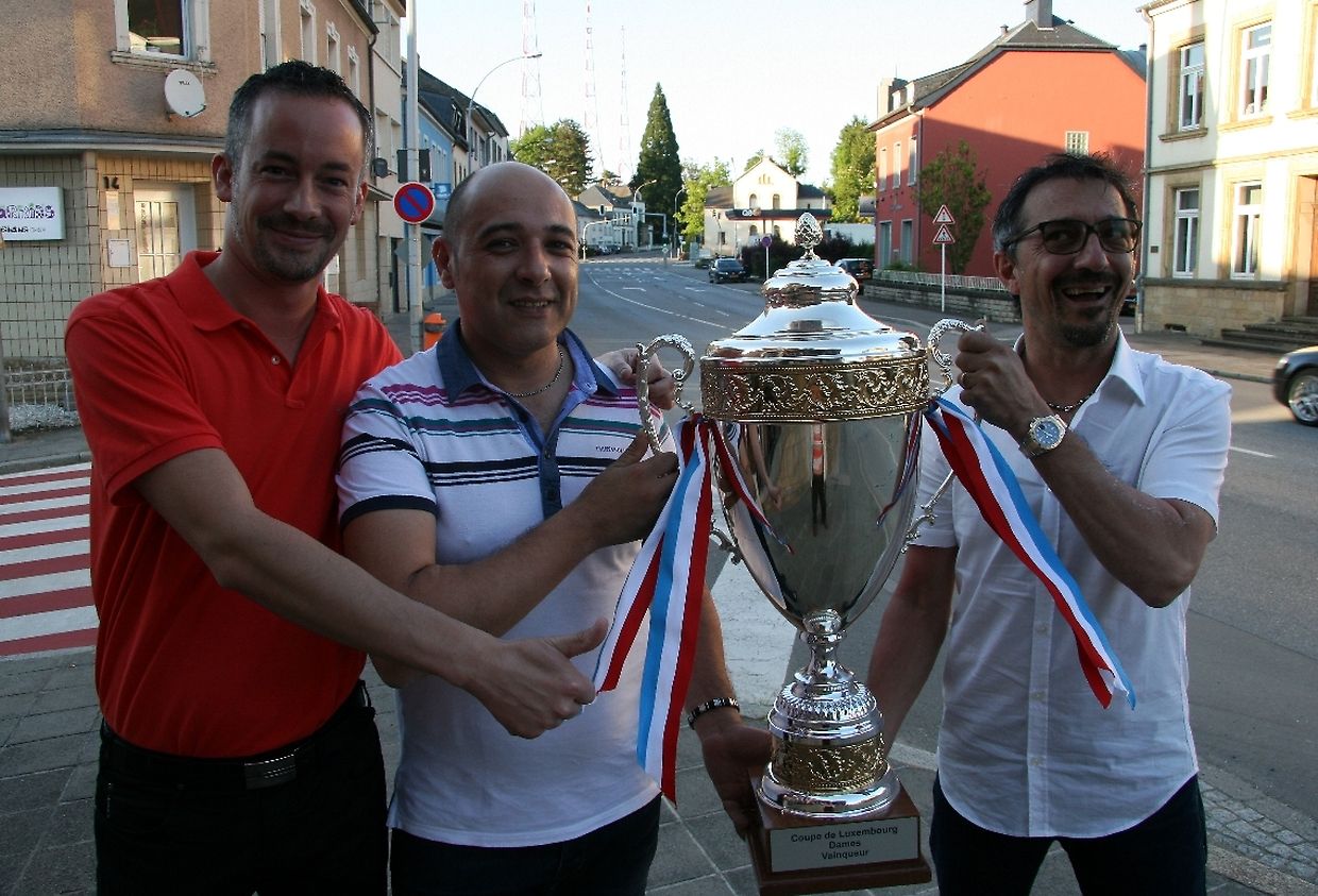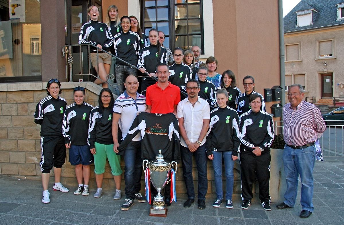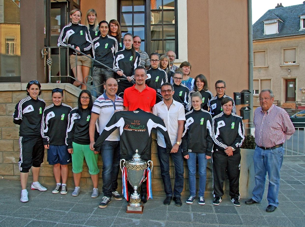 Bei de Spillerinnen war d'Freed nach grouss iwwer den Doublé: Landesmeeschter a Coupe-Gewënner! Immens frou ware si natierlech och iwwer déi nei Kostümen a si an hiren Trainer, de Carlo Calmes, hu verséchert, datt si mat ganz vill Hoffnungen op déi nei Saison waarden. Et war och nëmmen normal, datt d'Rose Settanni, Kapitän vun der erfollegräicher Equipe, d'Coupe mat op dës flott Feier matbruecht hat; esouguer de Männer huet déi Coupe gefall! De President vum Veräin, de Claude Kremer, huet dem Alessandro de Marco an dem Sergio Aires en décke Merci gesot fir dee schéine Geste an déi flott Ënnerstëtzung, an dat an enger Zäit, wou et net méi esou einfach ass fir Sponsoren ze fannen. (dd)