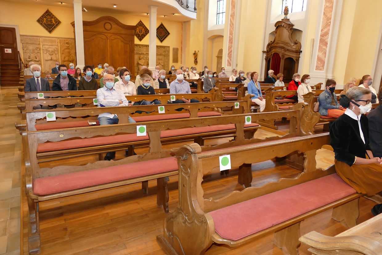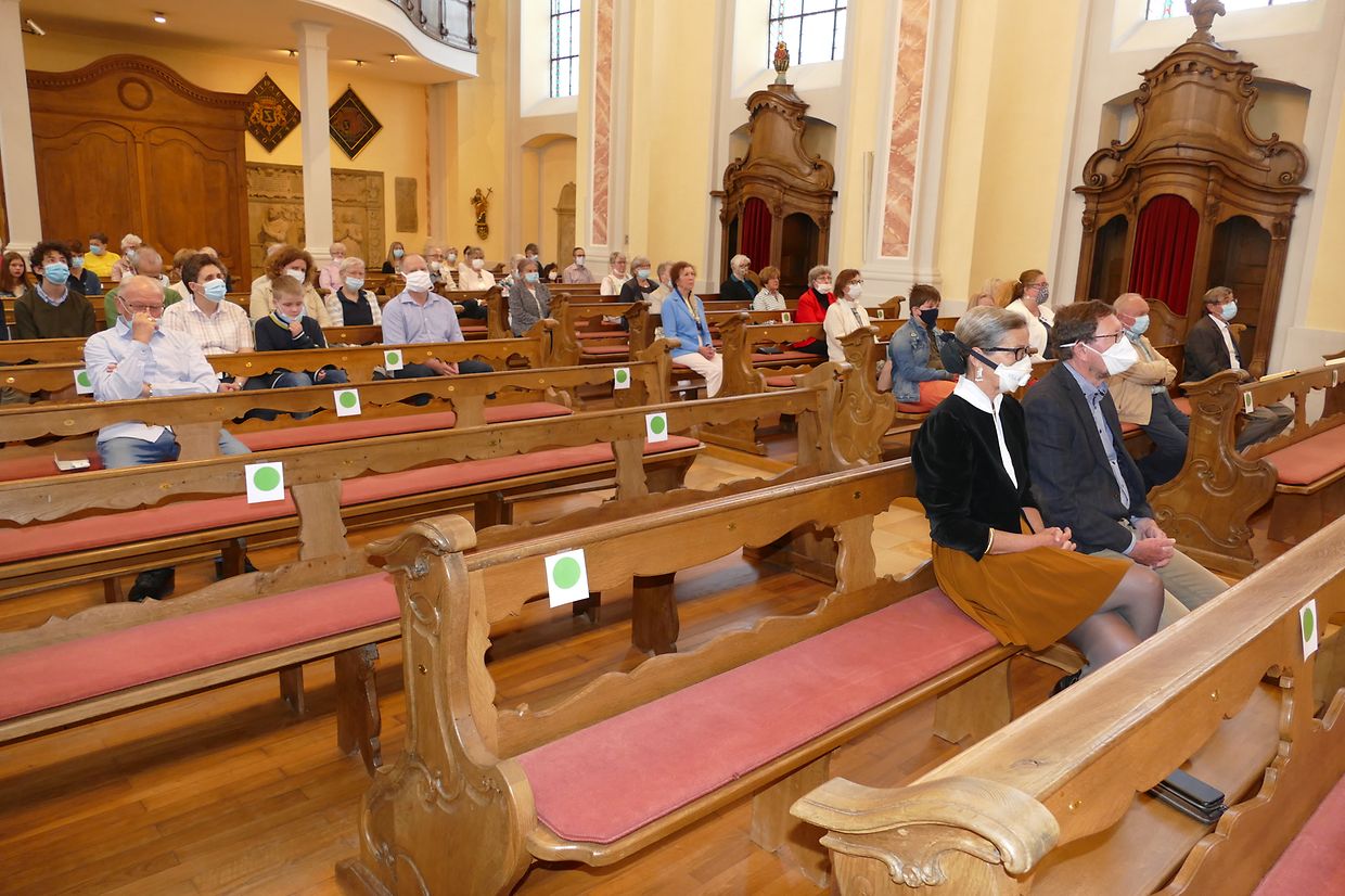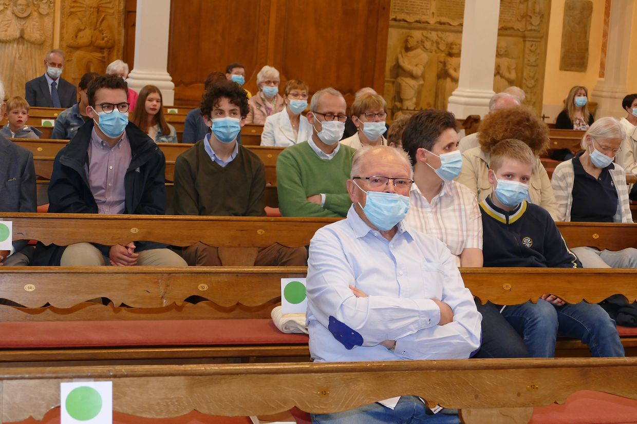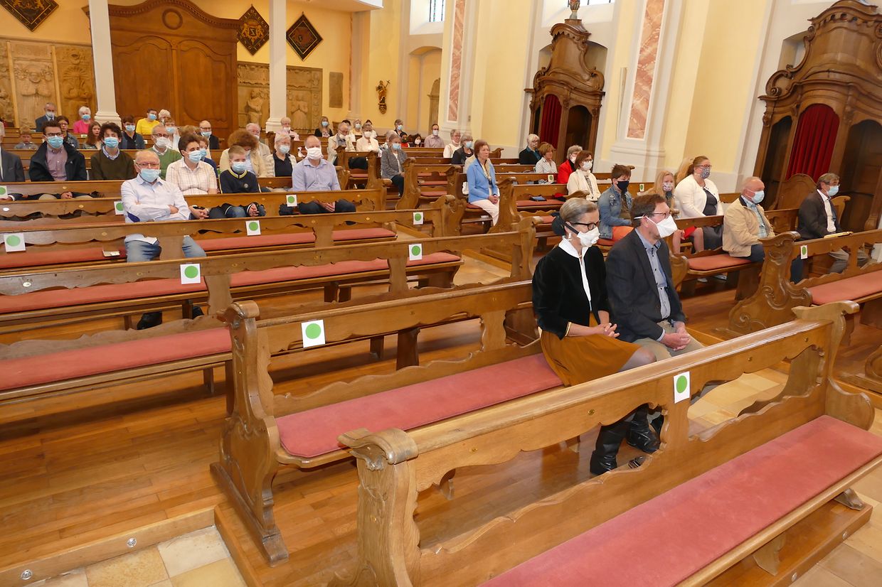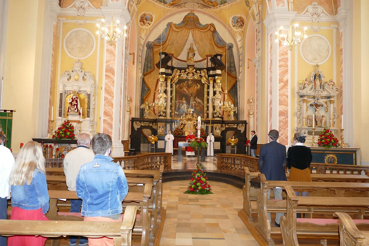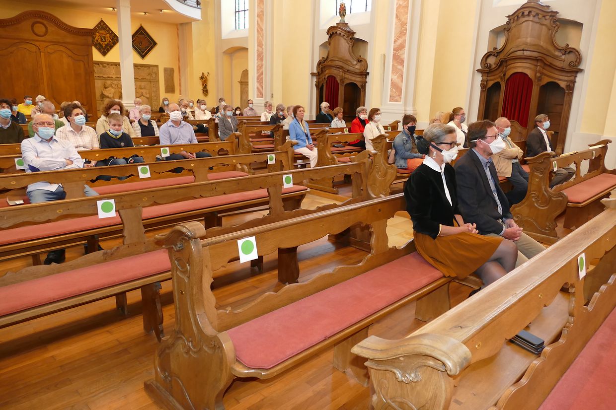 Päischtsonndeg huet de Paschtouer Nico Jans d'Mass an der schéiner Barockkierch zu Jonglënster gehalen. De Kantor Luc Nilles an den Organist Laurent Felten hunn déi sëllege Leit, déi do waren, agelueden, matzesangen. Et huet ee gespuert, datt d'Leit richteg frou waren, datt si erëm an d'Kierch konnte goen; si hu betount, datt ouni Sonndesmass et kee richtege Sonndeg gëtt, a scho guer kee Päischtfest.