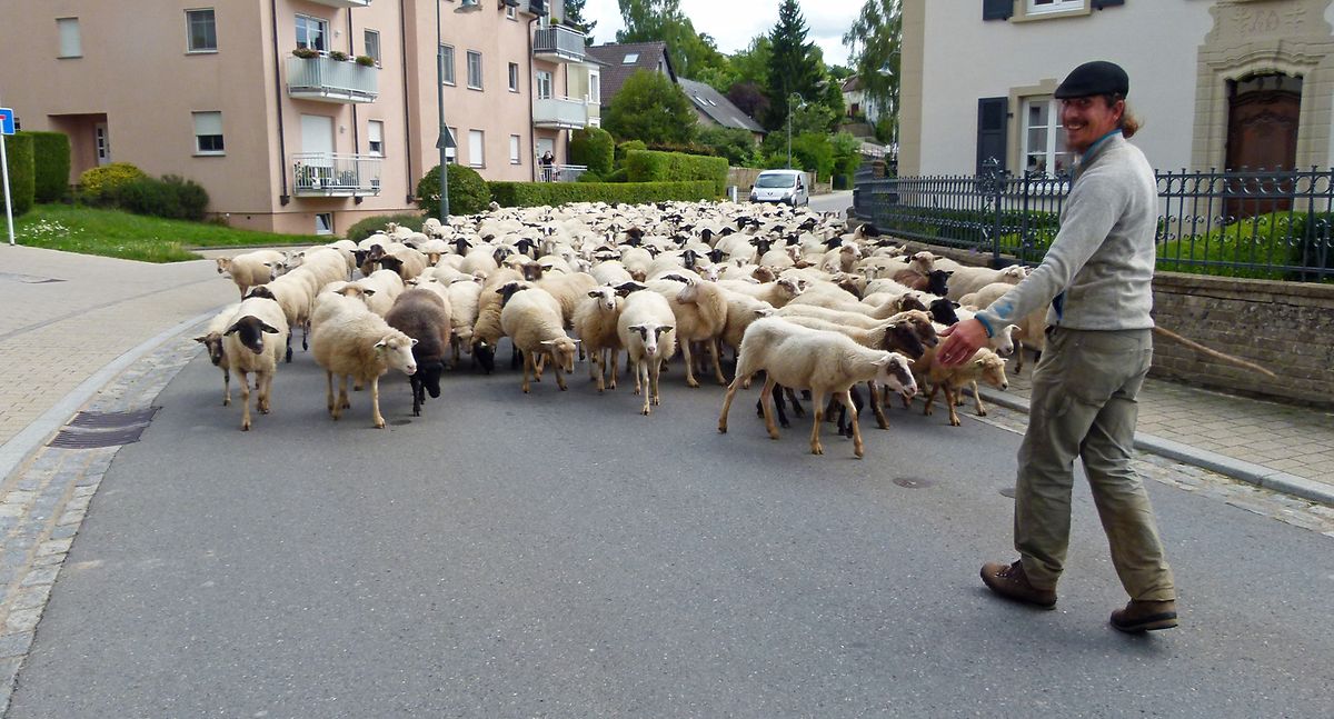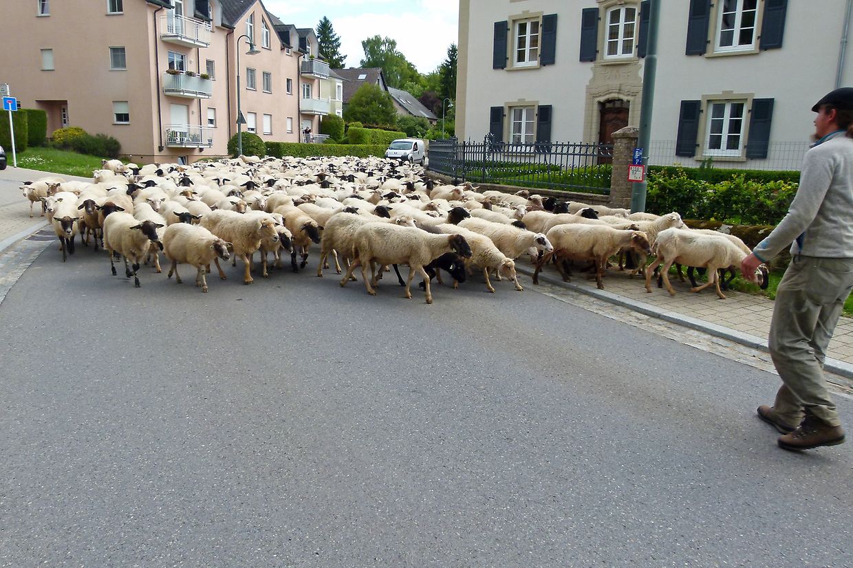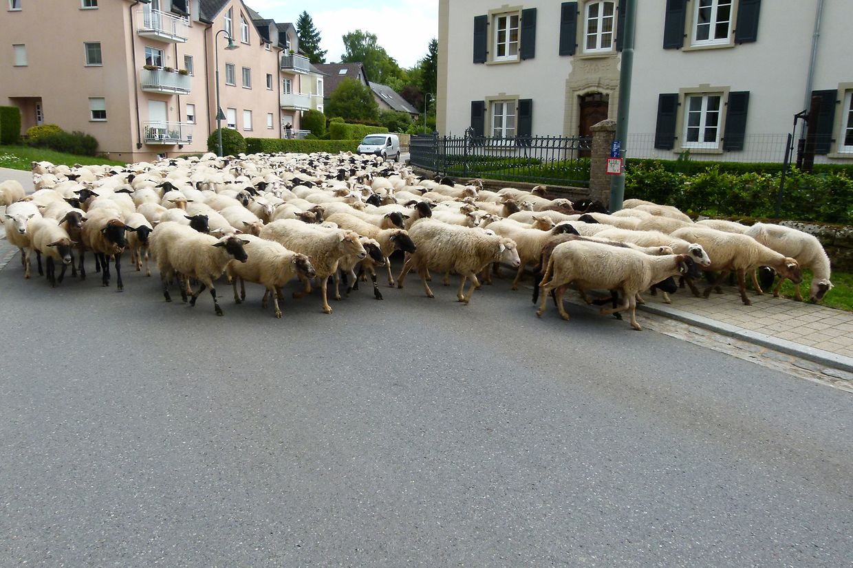 Im Augenblick sorgen die Schafe für eine naturnahe und umweltfreundliche Abgrasung von Weideflächen in der Umgebung von Junglinster. Imposant war das Bild der Schafsherde, die am Nachmittag von der Weidefläche um den Lënster Bierg zu einer andern Weidefläche im Westen der Ortschaft durch die Straßen von Junglinster zog. Geduldig sahen sich die Autofahrer dieses seltene Ereignis an, das ja ziemlich ungewöhnlich auf unsern Straßen ist.