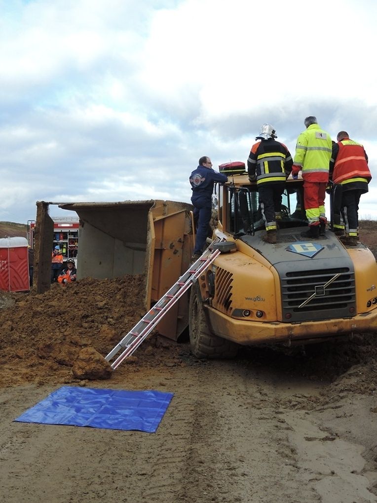 Vermutlich durch Unwohlsein des Fahrers kam ein mit Erde beladener 50-Tonnen Muldenkippen in einer Kurve um ins Rutschen. Durch die Bauart des Fahrzeuges kippte der Hintere Teil komplett um, die Fahrerkabine blieb stehen. Der erkrankte Fahrer musste aufwendig von der Feuerwehr aus seiner Kabine gerettet werden. Er kam mit dem Hubschrauber der Air Rescue zwecks Behandlung ins diensttuende Krankenhaus nach Luxembourg.