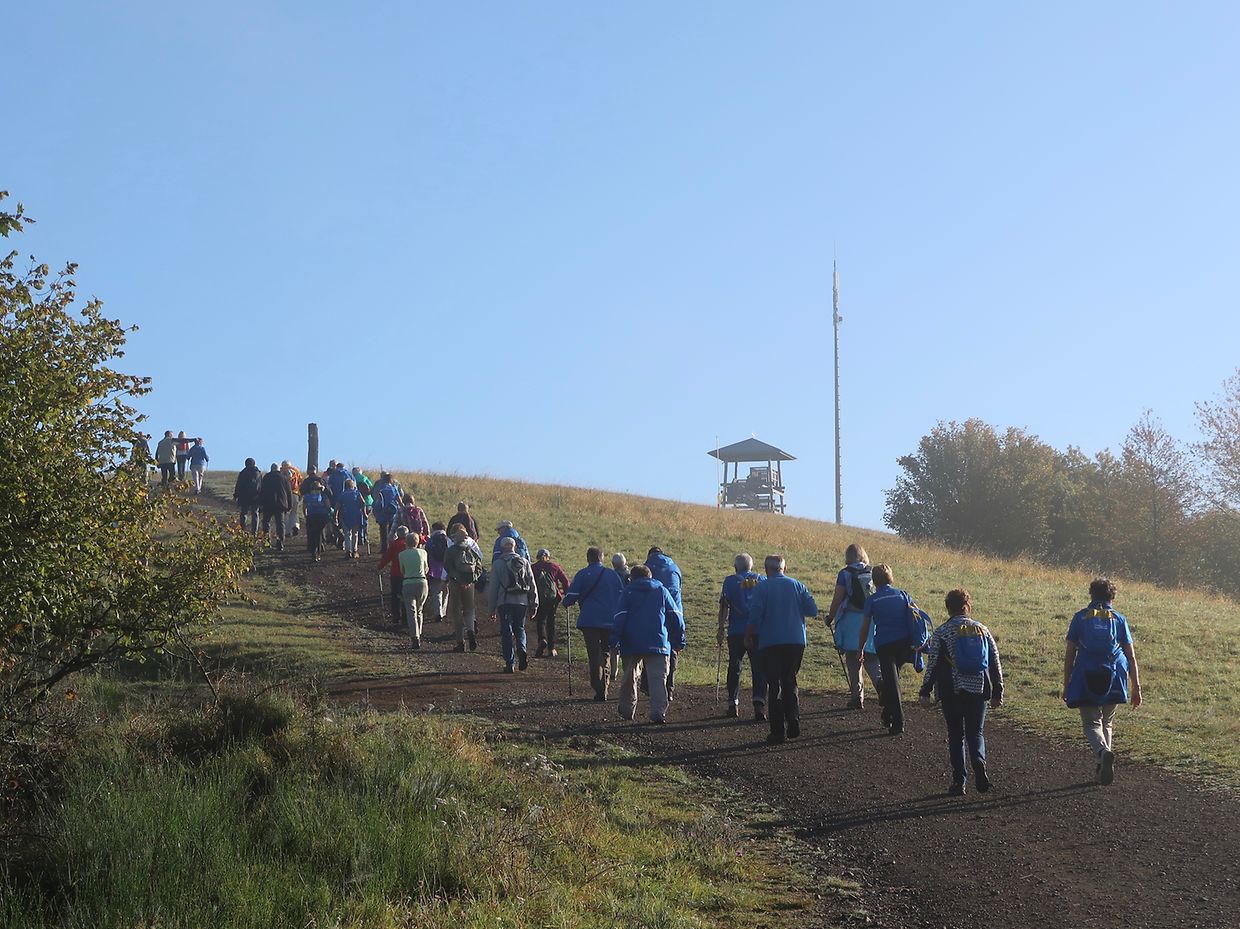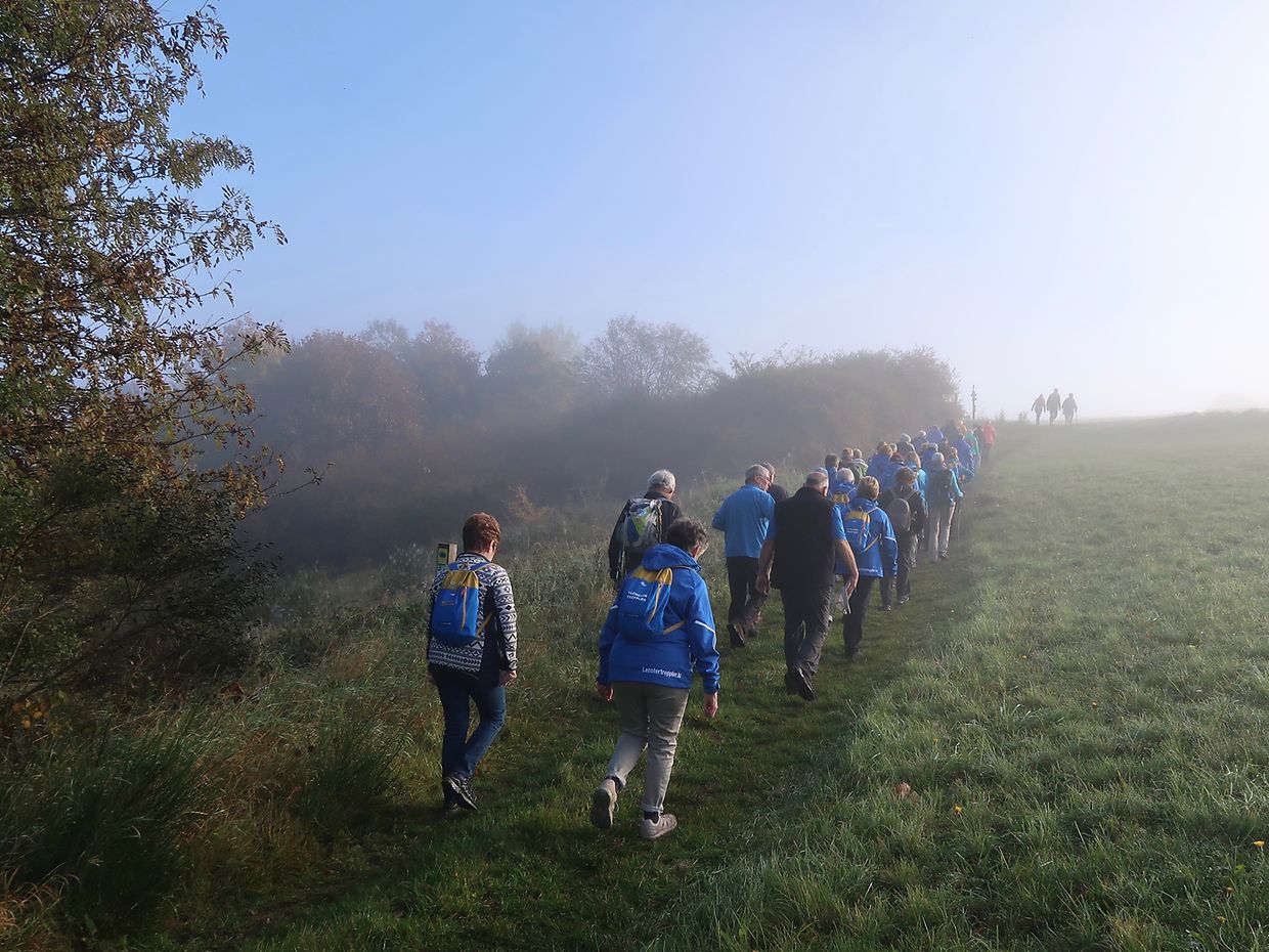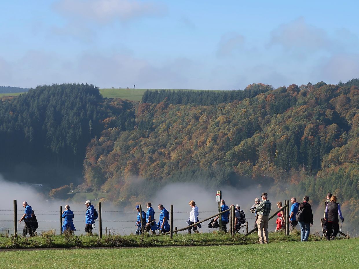 Die > LËNSTER TRËPPLER haben kürzlich der Junglinster Partnerstadt in der Eifel, Üdersdorf einen Wanderbesuch abgestattet. Zusammen mit den Wanderfreunden des Eifelvereins ging es im morgendlichen Nebel los um auf eine Höhe von 515m zu wandern und den "Landesblick" zu erkunden. Hier servierte der Eifelverein denn auch eine vorzügliche Stärkung und nach einer Rast führte der Weg weiter durch wunderschön herbstlich gefärbte Wälder, entlang der Meerfelder Maare. Später wurde auf der Sonnenterasse der Heidsmühle ein reichliches Mittagsmenu genossen.