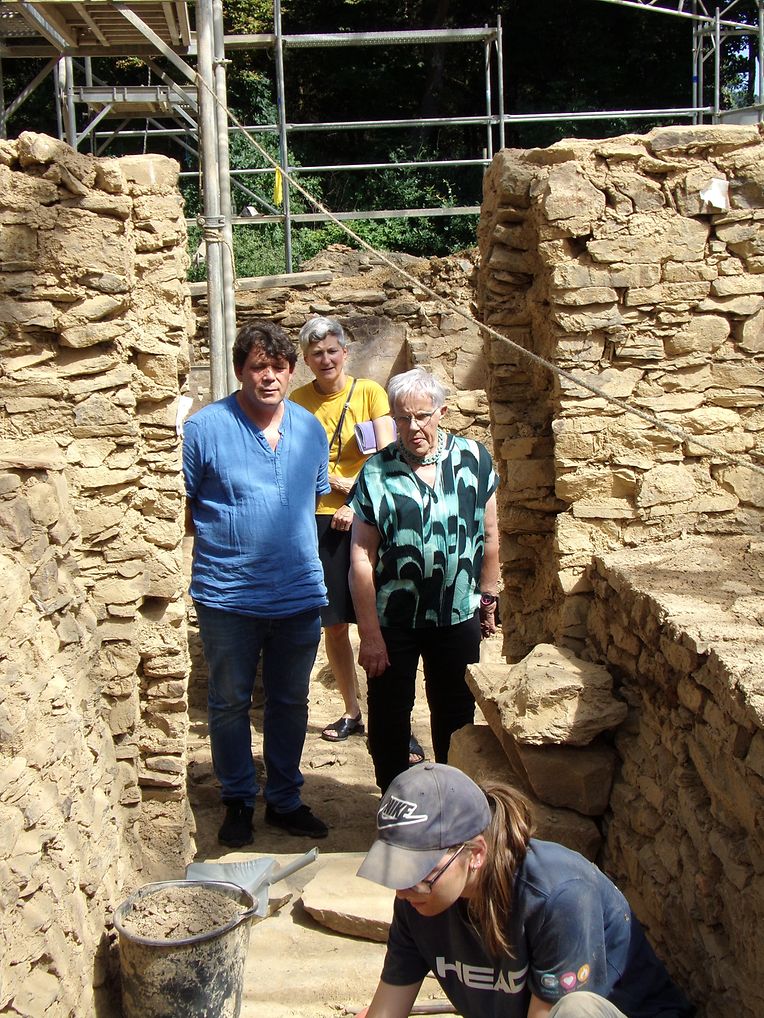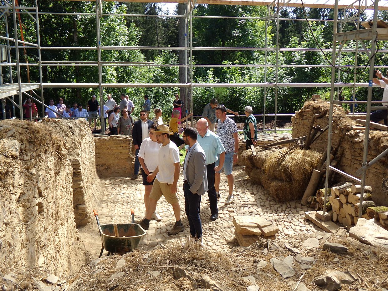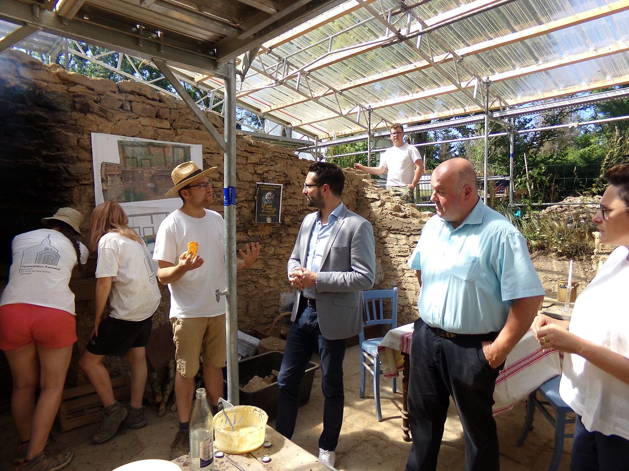 Duerno goung ët an d'Kapell, wou d'Madame Elisabeth Koltz vum INPA déi fachlech Erläuterunge ginn hott. Fir di nächst Etapp goung ët erof bei den Erklärpanneau vum ale Guttshaff. Den André Kirsch, Archeolog bei de Gruewungen, weist unhand vun den ale Fotoen vu 1936 wéi den Haff ausgesinn hott ier en ofgebrannt ass. Den Här Foni Lebrun, Direkter vum INRA, hott de laangjäregen Engagement vum Ministere um Përmeshaff betount. Als klenge clin d'oeil huet hien erzielt, datt hien well als Kand mat sengen Elteren op de Knupp koum obwuel Sie néck aus der Géigend stamen. Uschléissend gi mer erof an d'Ruinen wou eis Studenten equipe mat gruewen amgang ass. An denen eenzelne Reim gin d'Entdeckunge vun de Gruewungen erkläert. An der Kichen hunn d'Meedercher aus eisem Schaffertegrupp Wäffelchersdeeg preparéiert. Den Erik Thill däerf dann och selwer eng Wäffelchen an d'gossen Eise maachen déi dann am Bakuewen gebak gëtt.