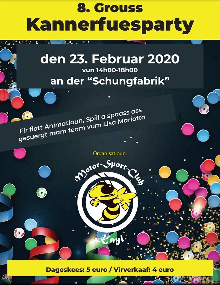 Am 23 Februar wird das motivierte Team die Traditionelle Kinderfastnachts Party in Kayl-Tetingen in der Schungfabrick zum 8 Mal in folge organisieren. Welches im Jahre 2019 von vollem Erfolg gekrönt war.