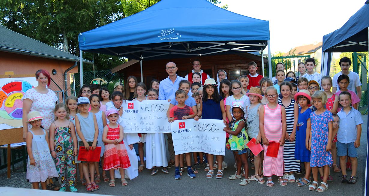 Traditionellerweis gouf d'Aarbechtsjoer an der Par Mamerdall - St. Christophe mat enger grousser Open-Air-Familljemass ofgeschloss. Uschléissend un d'Mass war wéi ëmmer e flott Grillfest, wat de Startschoss ginn huet fir d’Sozialaktioun vum nächsten Aarbechtsjoer. A fir d'Sozialaktioun vun dësem Joer ofzeschléissen, goufen 2 Schecken iwwerreecht: je 6.000 € kruten d'Asbl "Sourire en Haïti" an d'Asbl "Ile aux clowns”, déi e groussen Merci fir dëse generéisen Don ausgeschwat hunn. D’Sue goufen am Laf vum ganze Joer duerch verschidden Aktiounen gesammelt. Grouss a Kleng hunn an der Par dozou bäigedroen, datt dës enorm Zomm zesummekomm ass. E ganz besonnesche Merci ass awer un d’Sr. Modesta vun den Elisabetherinne gaangen. Si huet den Erléis vun hirem Floumaart-Verkaf gespend a mat 3.000 € wesentlech zum Erfolleg vun der Aktioun bäigedroen.