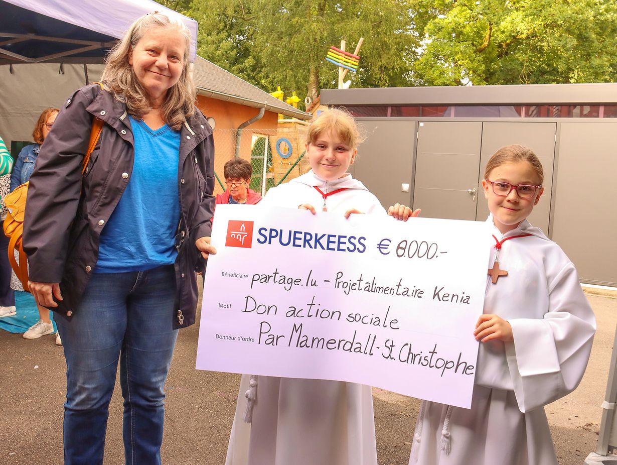 Zum Ofschloss vum Arbechtsjoer hat d'Par Mamerdall St. Christophe zu hierer traditioneller Open-Air-Familljemass op Keespelt agelueden. Um Uschloss un des flott Mass, gouf e Scheck vun 8.000 € un d'Fondatioun "partage.lu" iwwerreecht. Des Suën si fir en Ernährungsprojet am Kenia, deen de Mënschen am Distrikt Turkana hëlleft sech selwer ze ernähren. D'Madame Denise Richard huet als Vertriederin vu "partage.lu" de Scheck entgéint geholl an no e puer Erklärungen zum Projet, e grousse Merci gesoot fir dee generéisen Don. D'Suën sinn am Laaf vun dësem Arbechtsjoer duerch verschidden Aktiounen vun der Par gesammelt ginn. Dozou koumen dann awer och nach eenzel Don'en vu Privatleit, bei deenen besonnesch en Don vun 1.000 € vun der Sr. Modesta Sadler ervirgehuewe gouf. Déi flott Feier huet hieren Ofschloss fonnt mat engem Grillfest, mat deem glaichzäiteg den Ufank fir déi nächst sozial Aktioun vun der Par gemach gouf.