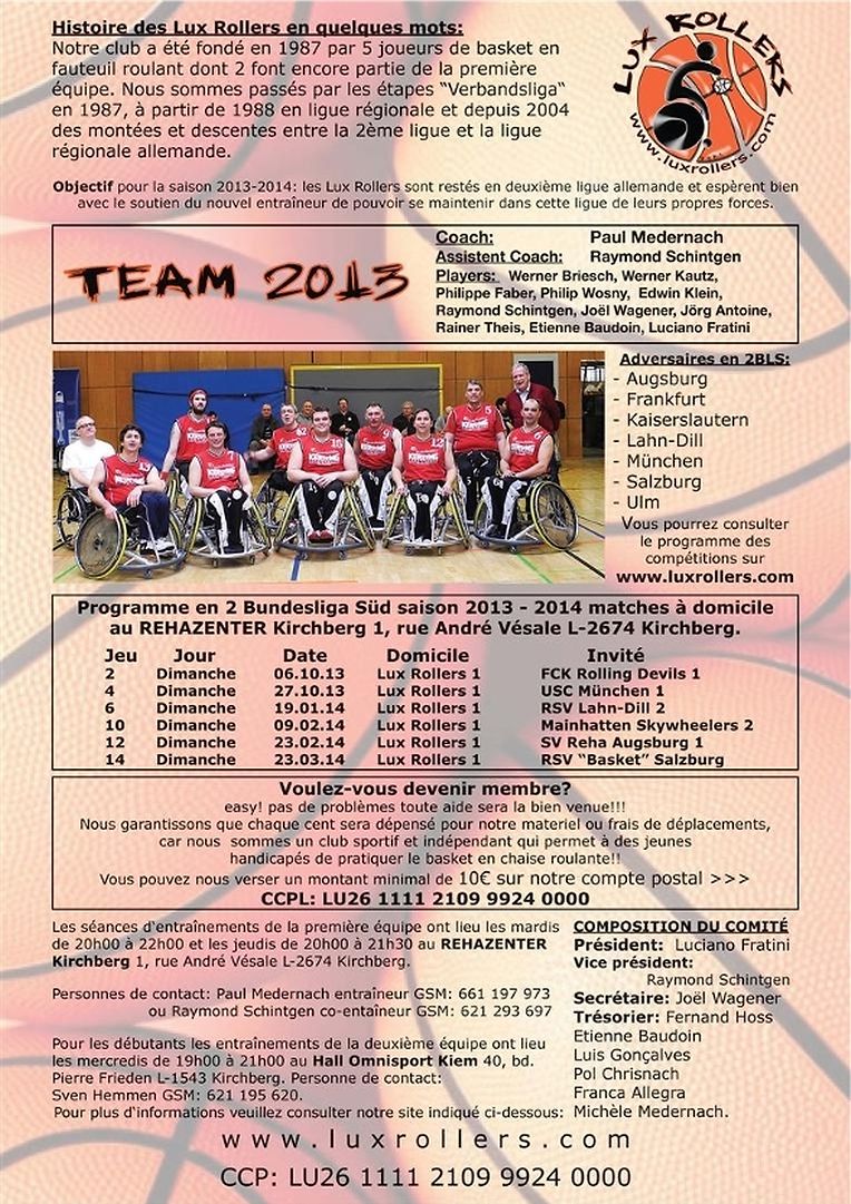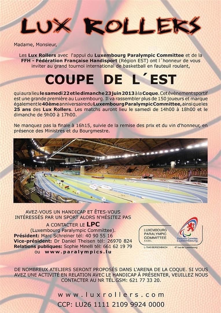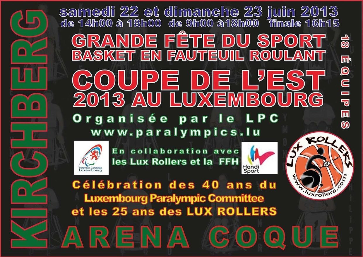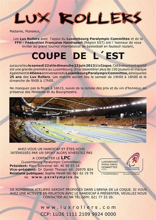 Cette année les Lux Rollers fêtent leur 25 années d’existence avec la fédération FSLH/LPC qui fêtent leurs 40 ans !! Nous avons eu le grand honneur de pouvoir intégrer la coupe Coupe de l’Est dans notre tournoi 2013 ce qui fera de celui-ci l’évènement le plus grand jamais organisé au Luxembourg pour le basket en fauteuil roulant en réunissant 17