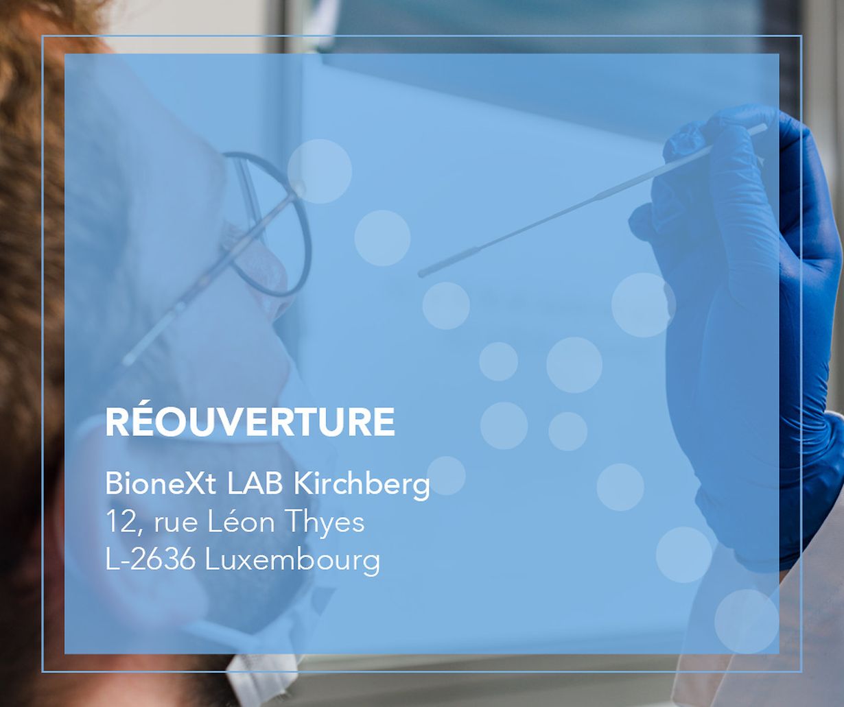 Le laboratoire BioneXt LAB est heureux d'annoncer la réouverture à partir du Lundi 31 janvier de son centre de prélèvement de Luxembourg Kirchberg exclusivement pour les tests COVID-19 (Tests PCR et Tests Antigéniques Rapides).