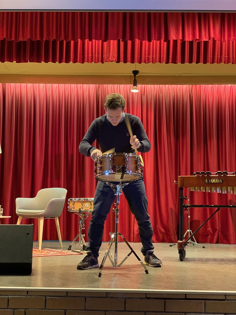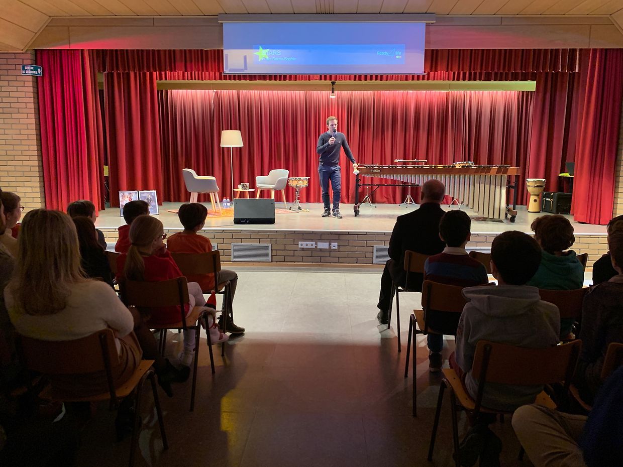 Nach einer weiteren Talkrunde und der Möglichkeit, spontane Fragen an den Künstler zu stellen, wurde der musikalische Vormittag mit einem Tango schwungvoll auf dem Marimba beendet und die Schülerinnen und Schüler konnten beschwingt mit dem ein oder anderen positven Impuls wieder ihre Klassenräume aufsuchen.