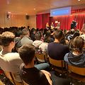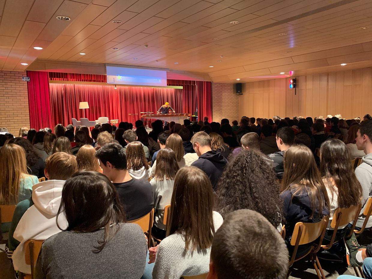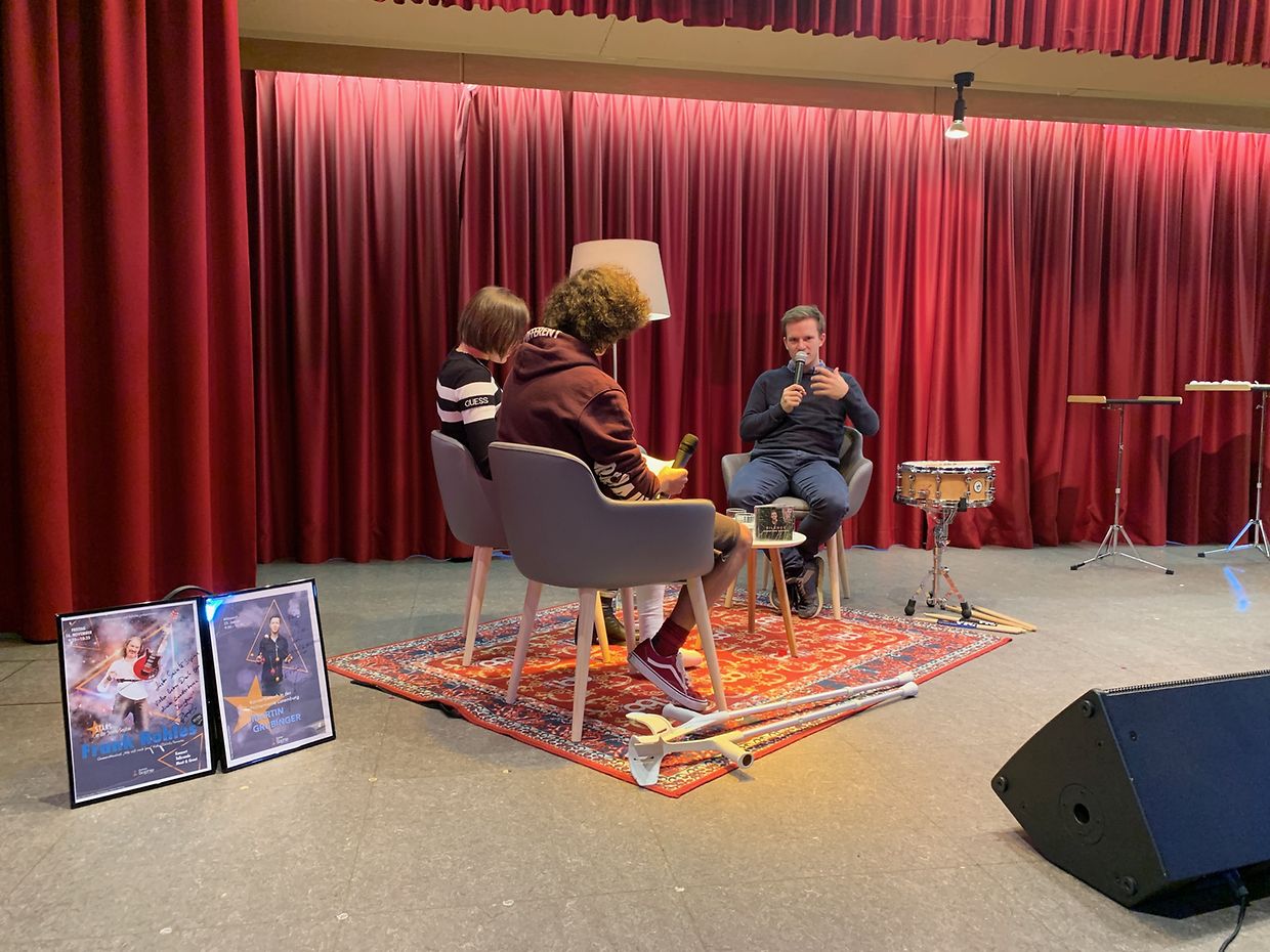 Der Darbietung auf dem Marimba folgte eine Talkrunde, in der der Multipercussionist allgemeine Fragen zu seiner Biographie, zu Instrumenten und Musik sowie zum Leben als Profimusiker gestellt bekam. Hier konnte der Musiker den anwesenden Schülern konkrete Anregungen geben, wie man sich am besten auf eine Sache konzentrieren kann oder wie man mit Niederlagen am besten umgeht. Hier machte er deutlich, dass auch ihn die modernen Medien, das Smartphone oft von seiner Arbeit ablenken und er daher bei Proben oft nur ein einfaches « Nottelefon », ohne Zugang zum Internet, bei sich trägt.