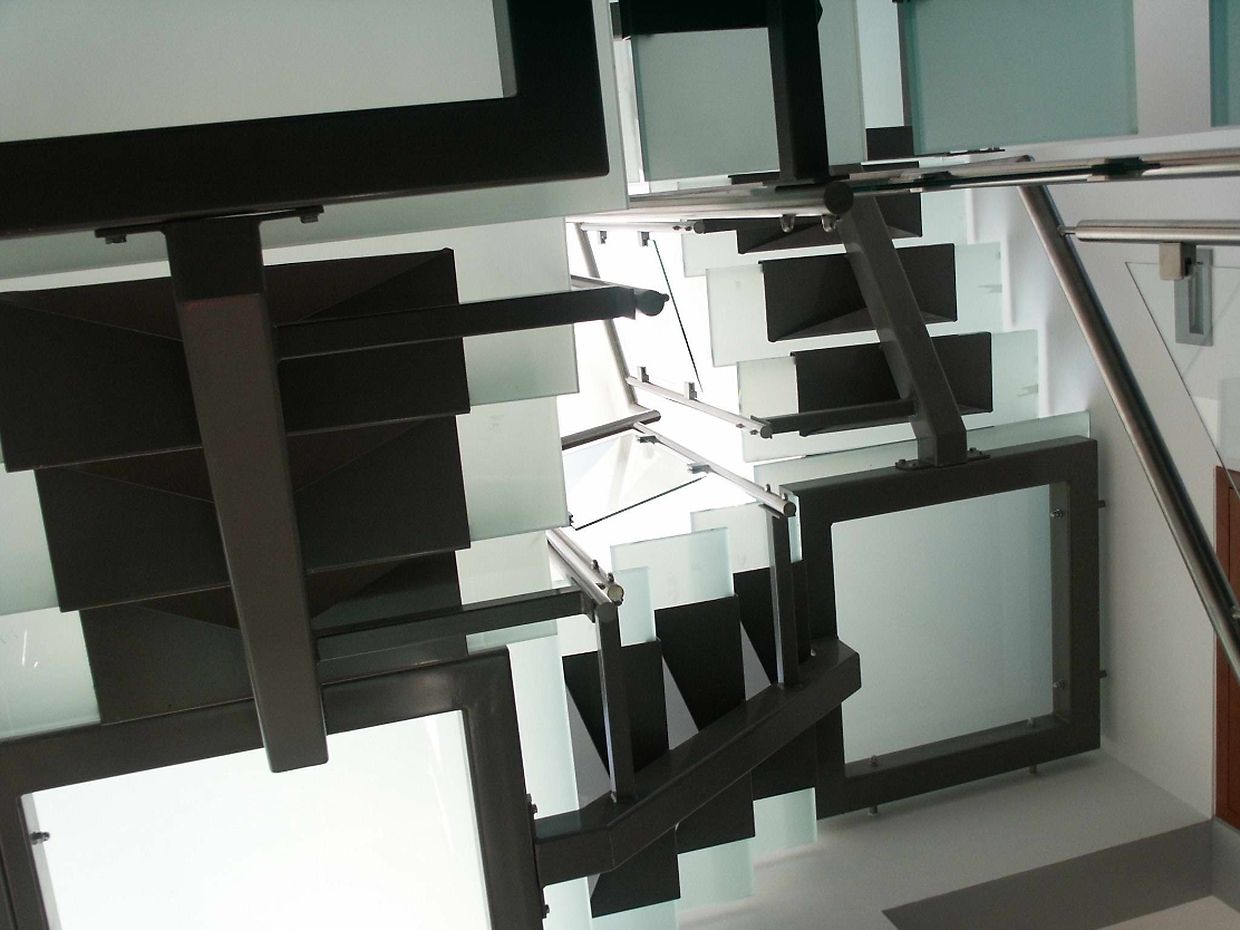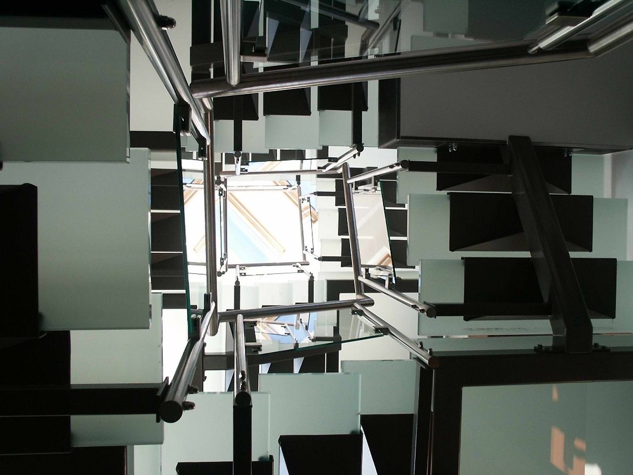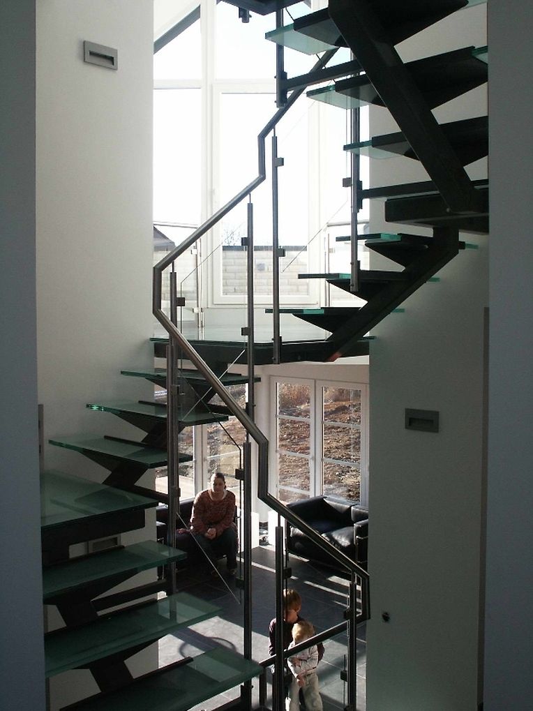 Ayant une maîtrise du design et de la plastique, l’architecte Thierry NOBEN décide d’emboiter les différents volumes autour de la circulation verticale. Cette dernière doit être originale par sa forme, mais aussi par sa composition : ossature métallique, marches et paliers en verre, permettant de jouer avec l’espace.