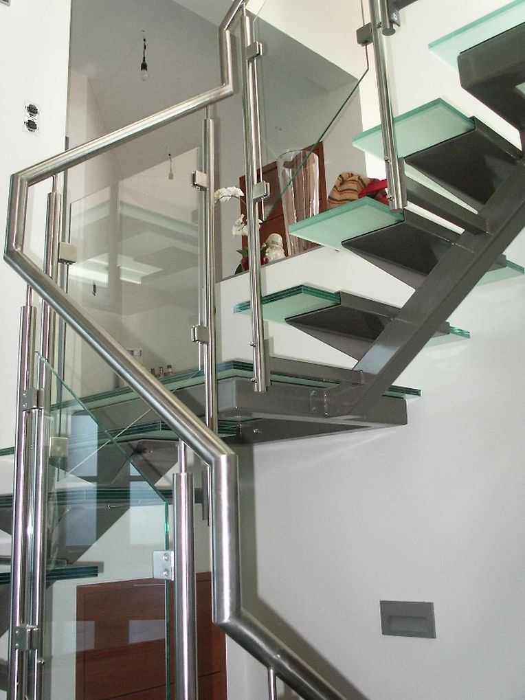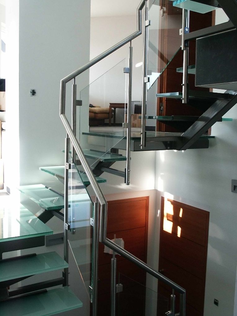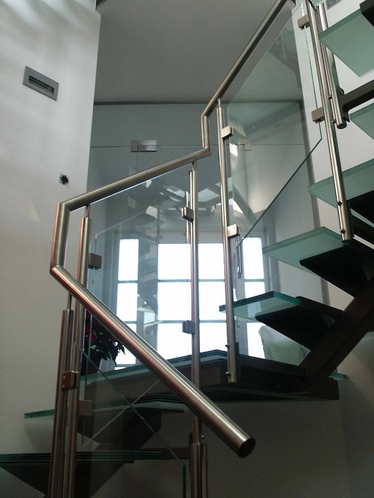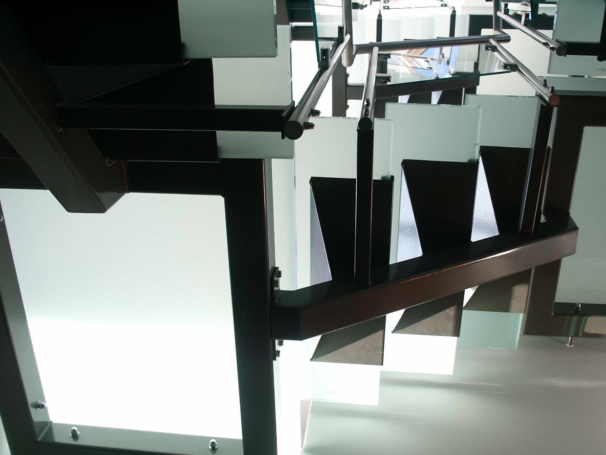 Ayant une maîtrise du design et de la plastique, l’architecte Thierry NOBEN décide d’emboiter les différents volumes autour de la circulation verticale. Cette dernière doit être originale par sa forme, mais aussi par sa composition : ossature métallique, marches et paliers en verre, permettant de jouer avec l’espace.