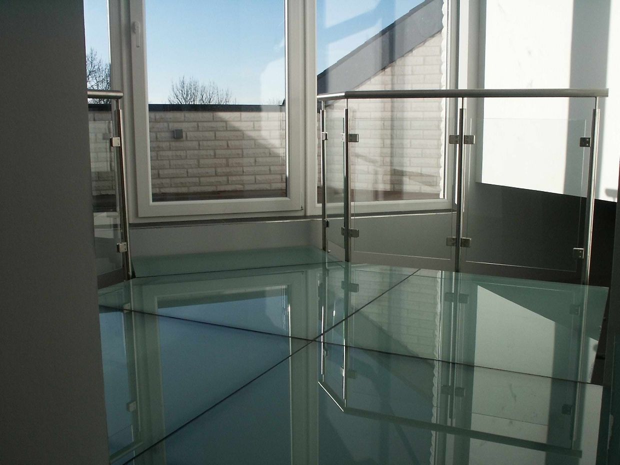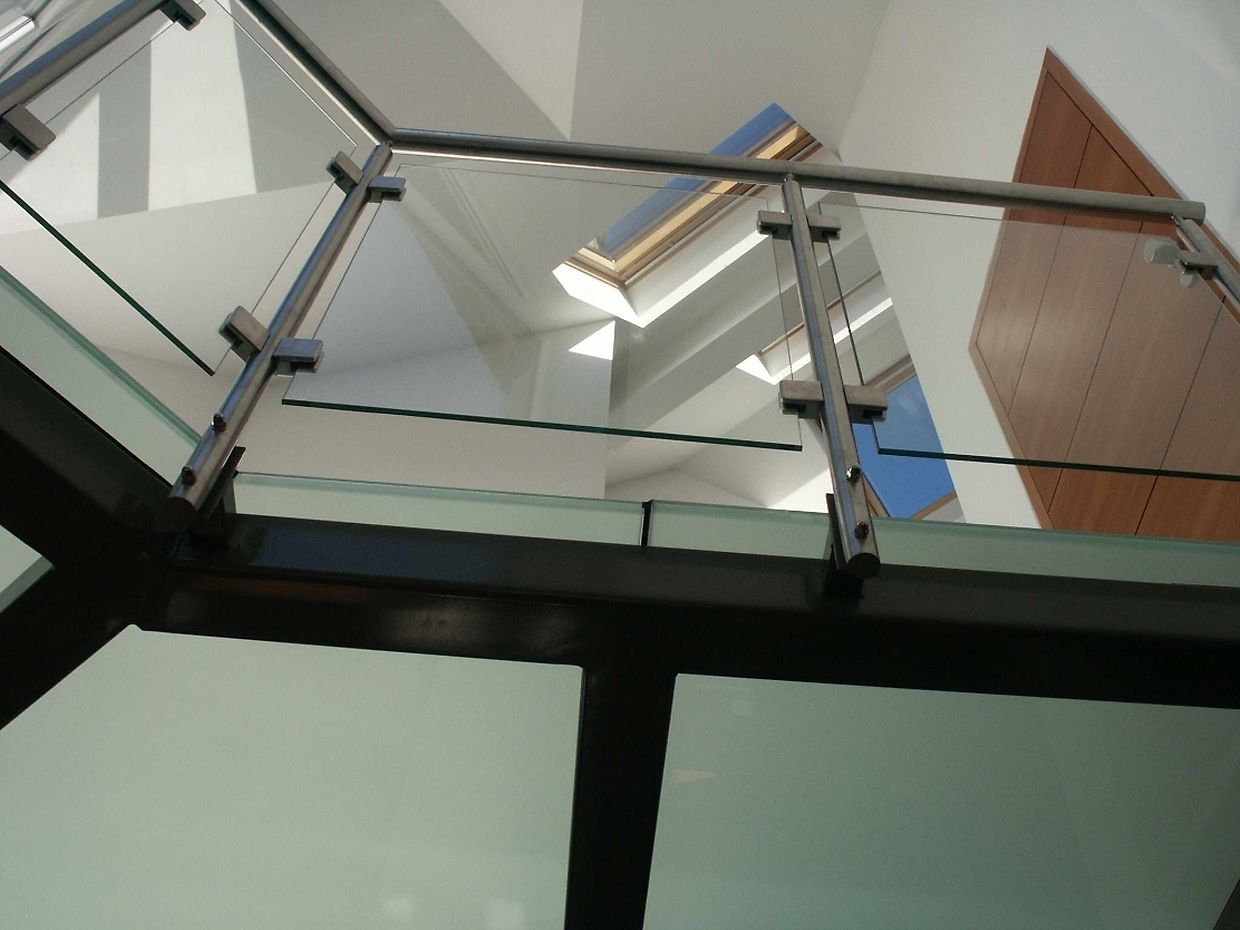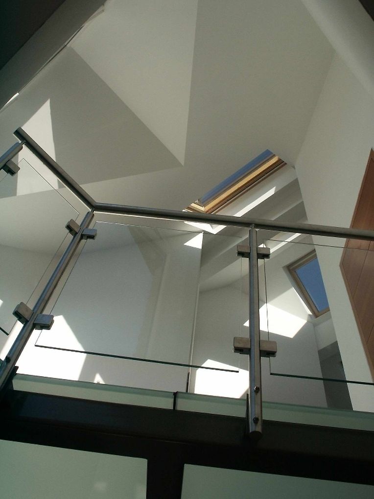 Au 1er étage l’escalier se poursuit par une mezzanine elle aussi en verre, nous invitant à aller sur une terrasse par le biais d’un élément vitré épousant la forme du toit. L’ensemble est volontairement déstabilisant car on ne sait plus où se situe l’intérieur de l’extérieur. Cet ensemble procure une sensation de liberté.