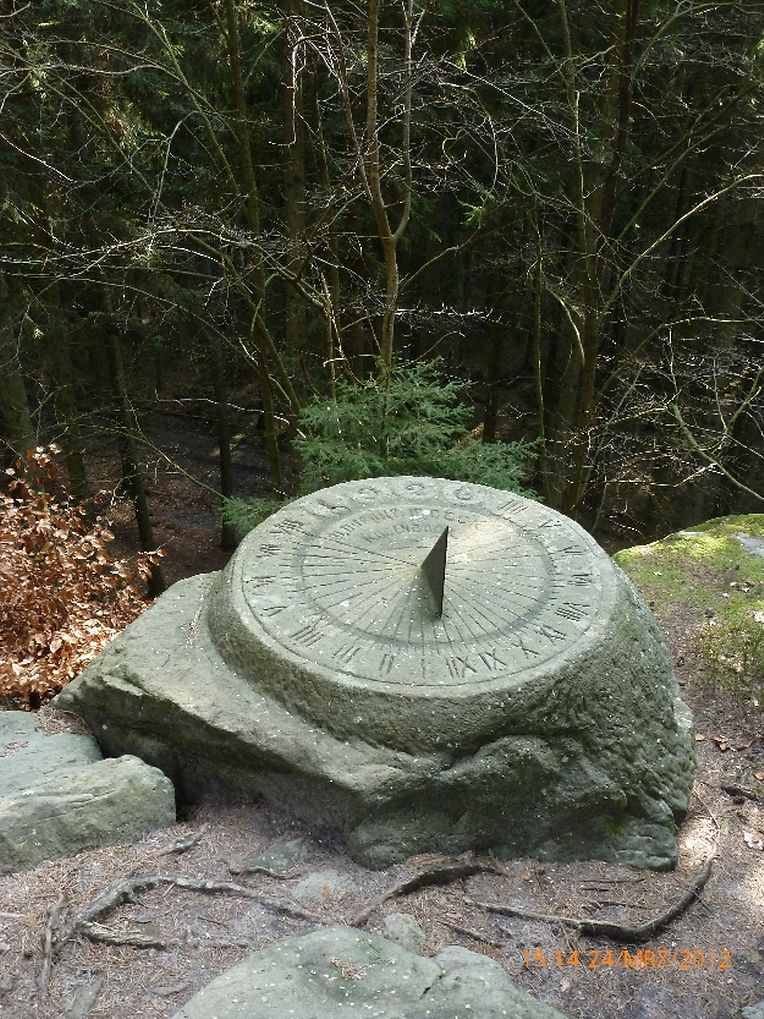 • die ´´ Sonnenuhr ´´, welche 1926 von 2 Einwohner aus Kobenborn hier in eine Felsplatte eingemeißelt wurde,
