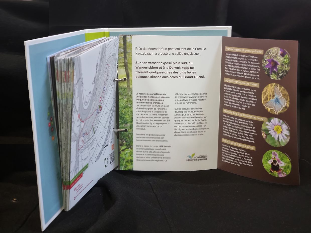 A travers son nouveau topoguide – 40 Années- 40 Réserves - 40 Sentiers, la Fondation Hëllef fir d’Natur met en lumière 40 sentiers à parcourir à pied. Des plateaux de l’Eislek aux paysages de la Moselle, la Fondation nous amène à la découverte de la richesse et de la diversité de la flore, de la faune et des milieux naturels traversés : les forêts de ravin et les ruisseaux de la vallée de l’Our, les taillis de chêne, les roselières, les vergers à haute tige, les vignobles en terrasses, les pelouses sèches calcicoles ou encore le jardin méditerranéen et la station d’élevage des moules perlières.