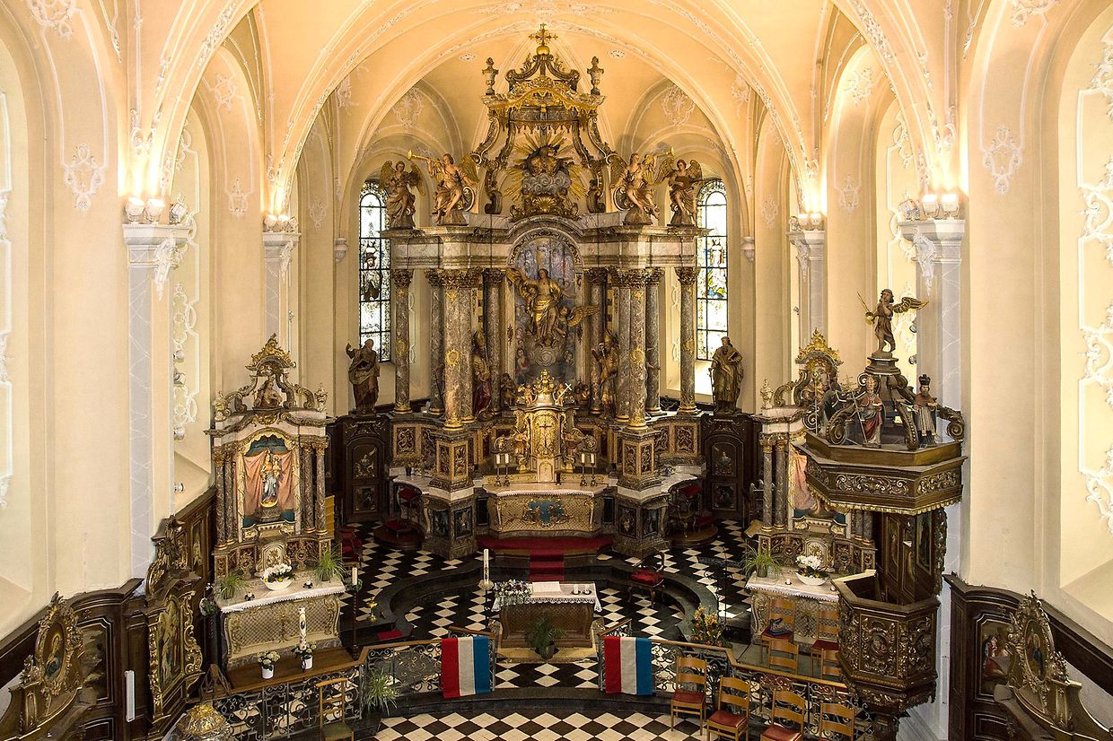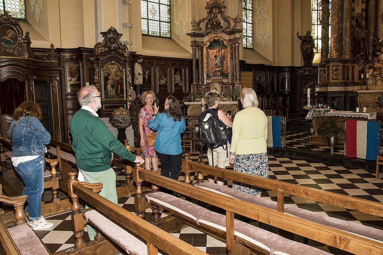 Dee klenge Grupp huet sech fir d’éischt eis wonnerschéin Barockkierch mam Kierfent ronderëm ugekuckt. D’Marie-Paule GLEIS huet hinnen Erklärunge ginn zur Kierch a wierklech beandrockt wor de Besuch vum Altor, dien aus Holz gemaach ginn ass a net aus Marmer, wéi si gemengt haten. Duerno hunn si och dierften hannert den Altor luusse goen, wou nach méi detailléiert Froe gestallt goufen. Begeeschtert waren si och vum Dafsteen, wou hir Virfaren dra gedeeft gi waren.