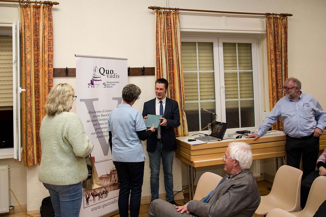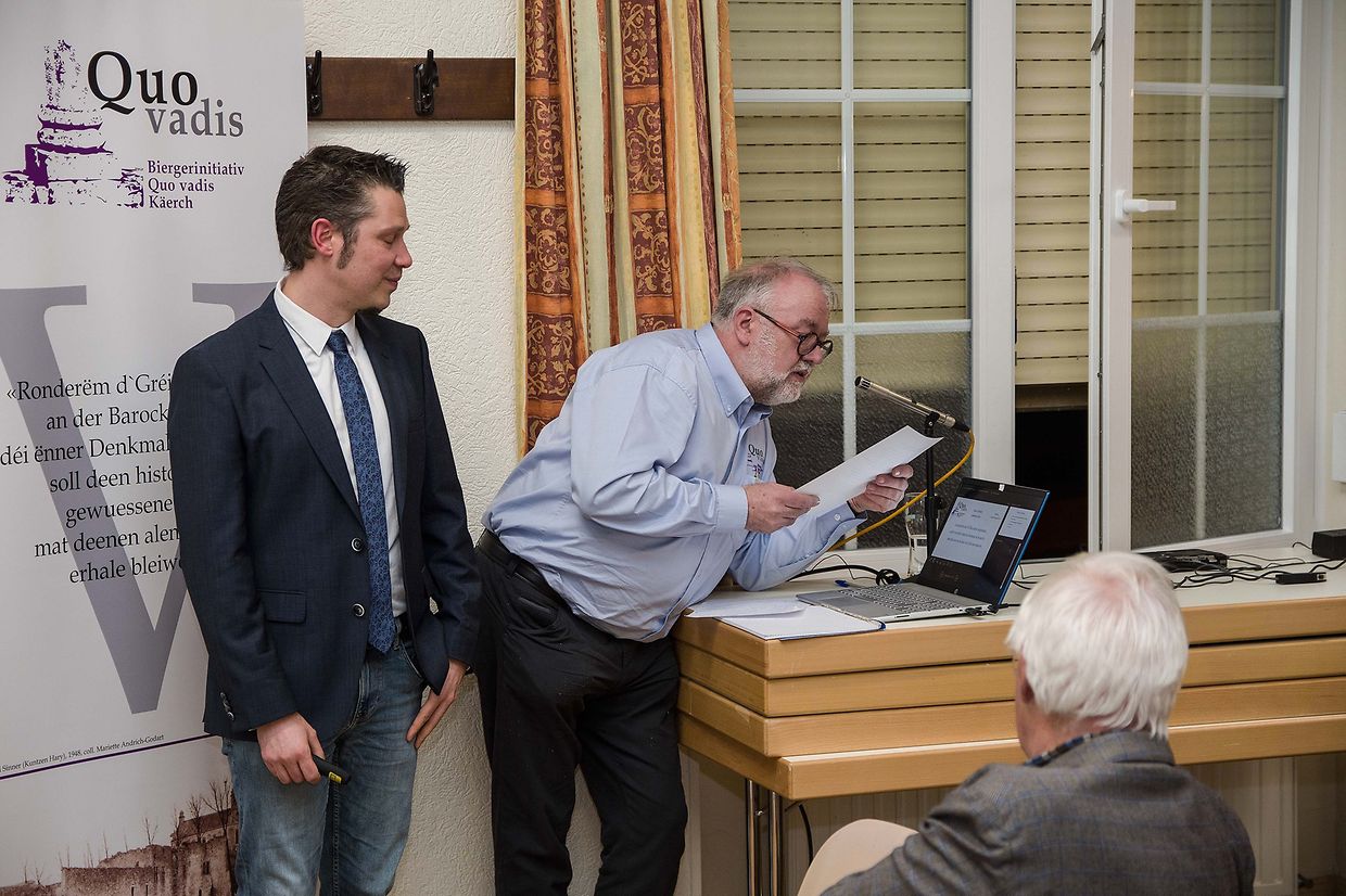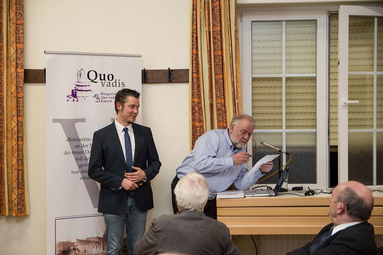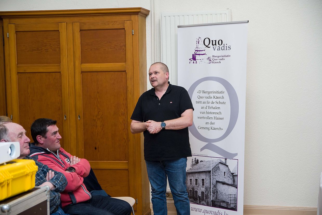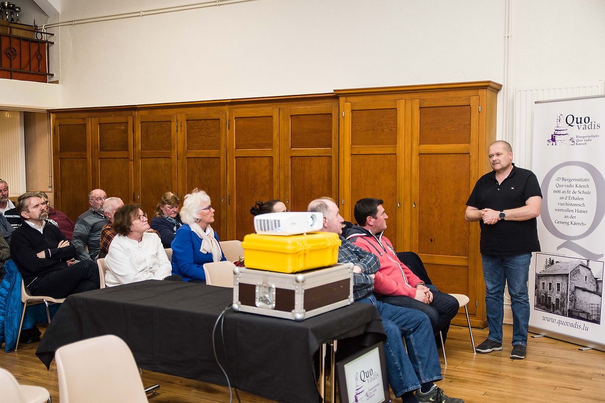 Viru kuerzem hat d’Biergerinitiativ Quo vadis Käerch seng Generalversammlung am prallgefëllte Remigiussall. De Prësident Fernand Toussaint huet nët gespuert mat Kritik un der Gemeng wat de Schutz vun historesche Bauwierker am Duerf Käerch ubelaangt. Amplaz ze suergen, dass dat gewuessent Duerfbild mat deene charakteristeschen Haiser erhale bleiwt, gin Haiser aus dem kommunale Schutz erausgeholl fir de Promoteuren ze erlaben eng « nullachtfünfzehn » Konstruktioun an d’Plaz opzeriichten. Nom gudd gefëllten Aktivitéitsbericht vum Sekretär Jean-Claude Muno huet d’Tresorière Aimée Steines eng gesond Keess kënne virweisen esou dass de Memberbeitrag konnt bäibehale gin. Duerch den Asaz vun der Biergerinitiativ an aneren Akteuren gin am Ament d’Grafplacken vun de Paschtéier Pastoret an Eyschen restauréiert. Dat selwecht soll och mat der Kierchendir geschéien déi duerch d’Witterung vill gelidden huet. No der eigentlecher Generalversammlung huet den Henri Carême, Docteur en histoire de l’art, eng interessant Konferenz gehalen mam Titel « Les peintres du XVIIIe siècle originaires, actifs ou établis dans la commune de Koerich : une découverte de leur vie et de leurs œuvres. »