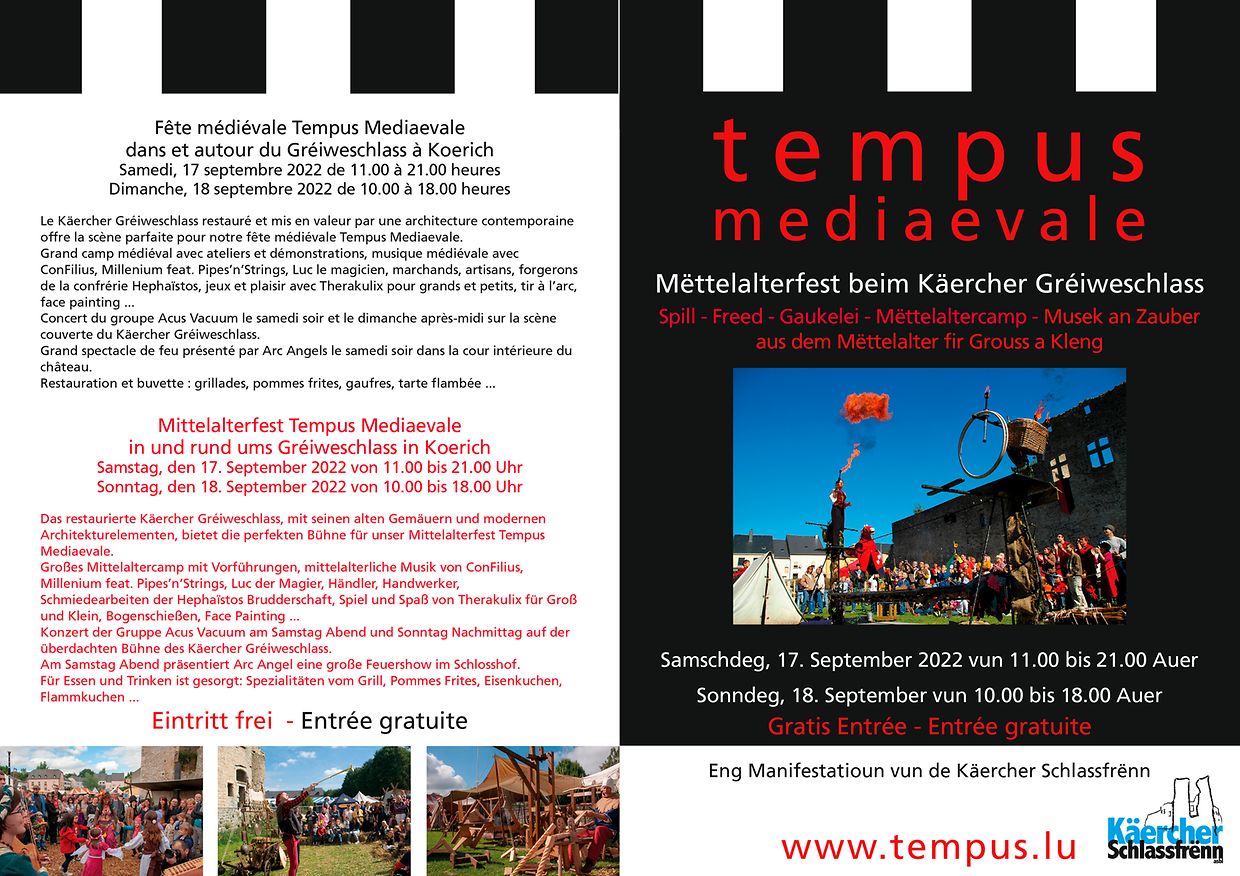 Den Entrée fir dëst Mëttelalter Fest em an am Gréiweschlas zu Käerch ass gratis och hei all weider Informatiounen um www.ksf.lu oder www.tempus.lu