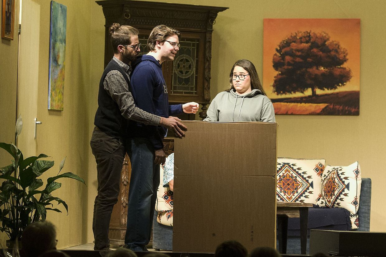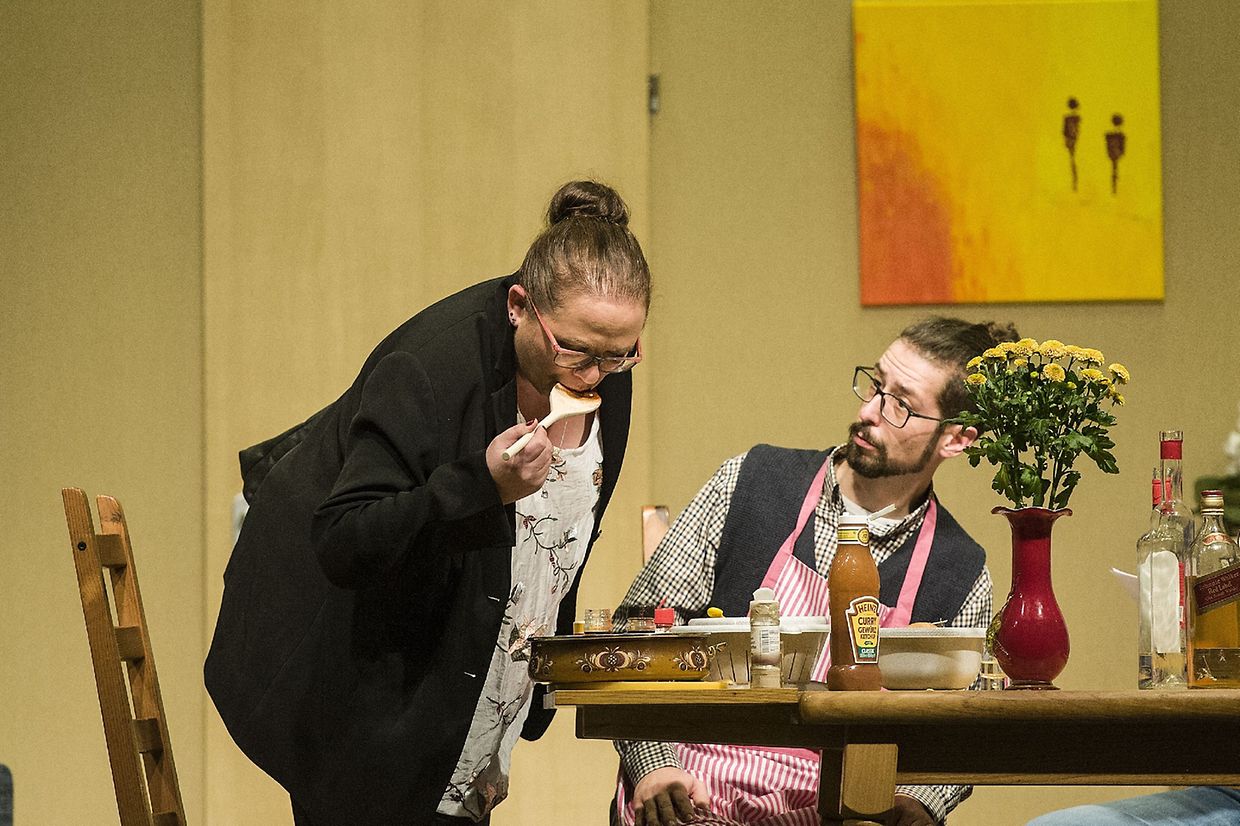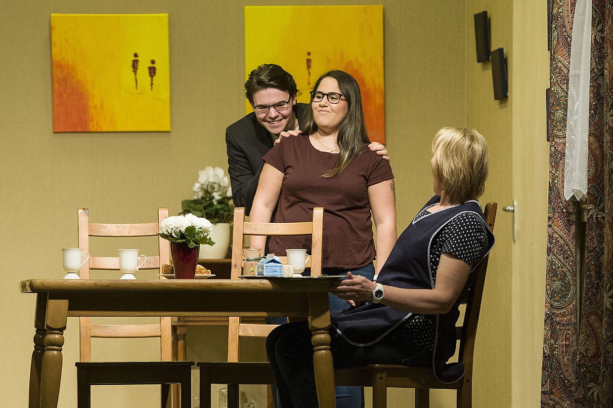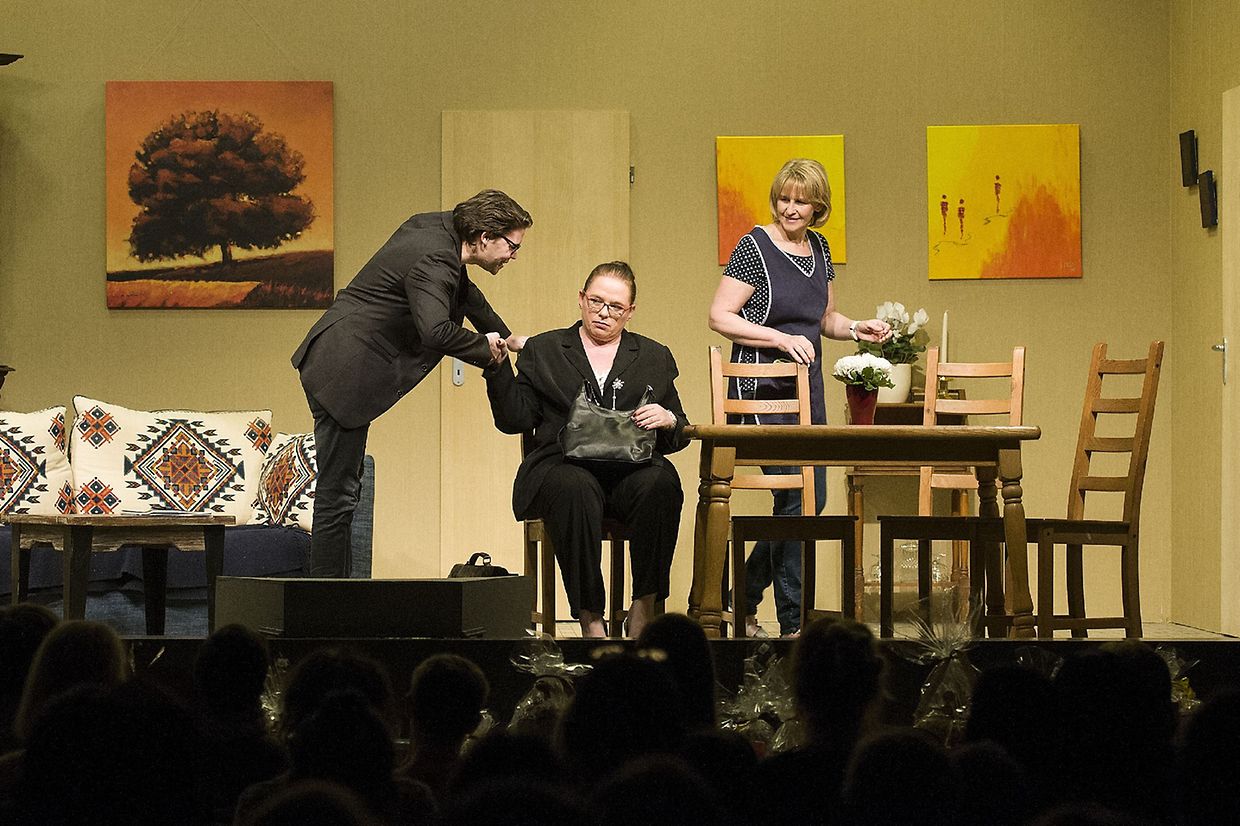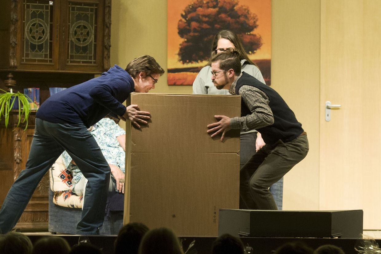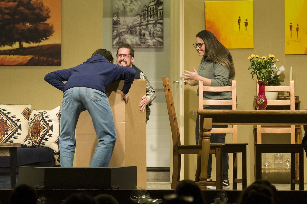 D'Publikum huet sech gutt amuséiert matt de Schicksalsgenossen, déi doheem erausgeflu sinn a sech hu mussen a miweléierten Zëmmer aquartéieren. Deen ee méi riicht eraus, de Buschauffer Charel (Nico Blitgen), do kennt et méi vun der Long op d'Zong an den Tristan (Yannick Hoffmann) leet seng Wierder éischter op d'Wo an ass méi op Harmonie beduecht. Dozou nach dën Här vum Haus, den Heng (Marcel Jost), dem ët och nit vill besser geet wéi denen zwéin Hausgäscht. Am Haus liewt nach d'Berta (Marie-Jeanne Gengler), d'Fra vum Haus, déi d'Box un huet an hier Duechter d'Liette (Jessica Fernandez), wat wees wat hatt wëll a sech gutt doduerch schléit. Dë Bréifdréier Jean Colis, genannt Stempel (Sven Jung) huet ën A op dat jongt Meedche geworf a muss matt allen Trickë géint der Mamm hiere Widerstand ukämpfen. Fir da schlussendlech alles an Opreegung zë brengen tauchen och nach dem Charel am Tristan hier Ex-Fraën Constance (Nessy Scherer) an Irina (Kamila Drouet) matt hierer Scheedungsaffekotin Vera Trenner (Sandy Stoltz) op. Ët gëtt ë schéinen Duergerneen an ën iwerraschendë Schluss.