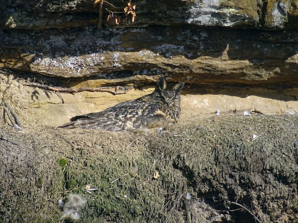Zur Zeit nistet ein Uhu in einer Felsspalte hier im schönen Eischtal in Koerich. Es ist das bereits das zweite Jahr dass er hier gesichtet wird. Da sein Federkleid den Farben der Felsen ähneln ist er nur schwer zu erkennen.