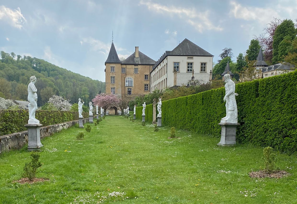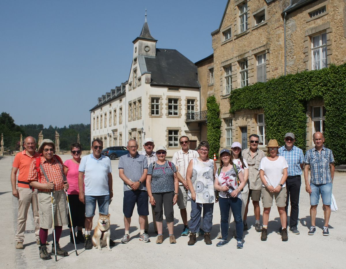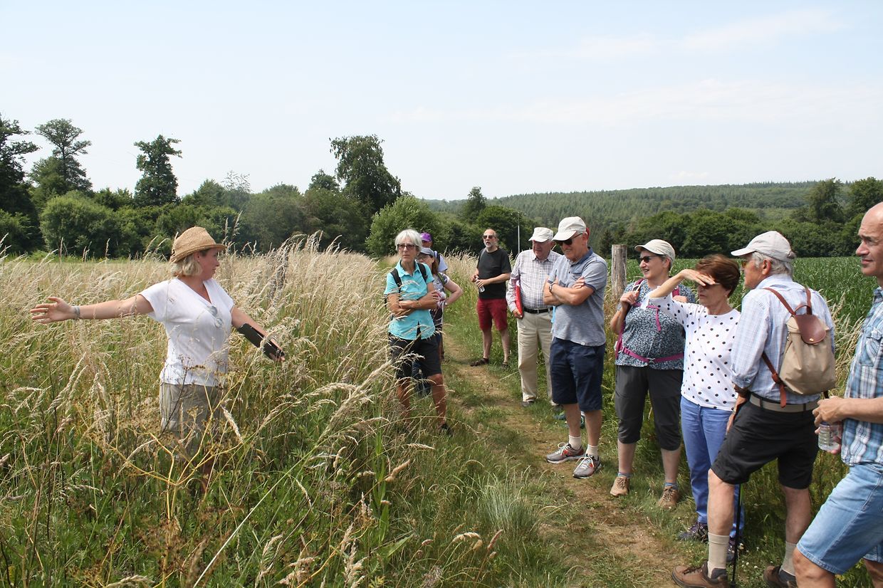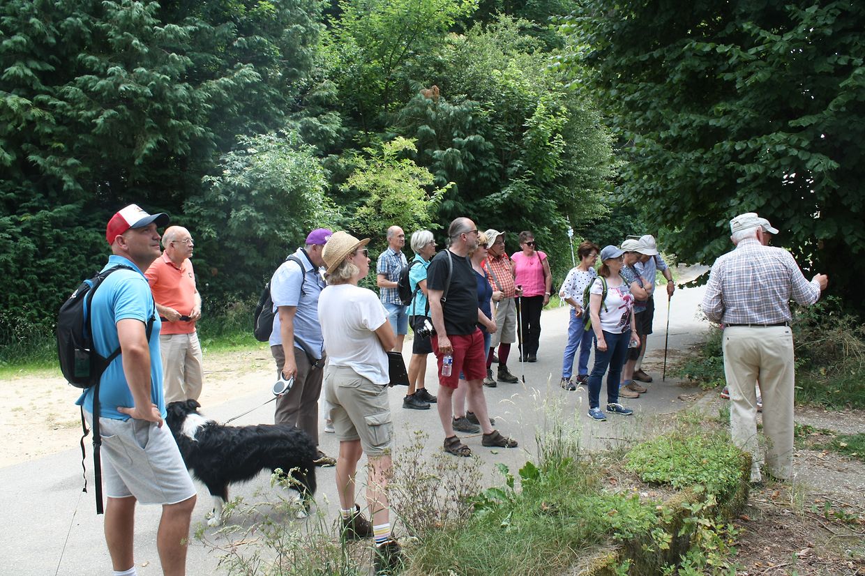 Dono, ënnerwee am Bësch, war et trotz der grousser Hëtzt deen Dag agreabel kill. Leider sinn och un de Beem schonn d’Suitte vum Klimawandel däitlech ze gesinn. Um Enn vum Ausfluch hu mir nach een Tour duerch d’Gäert vum Aansebuerger Schlass gemaacht, laanscht d’Uebstbeem, d’Rousestäck an d’Statuen aus der griichescher Mythologie. Aussergewéinlech ass déi 200 Meter laang Allee aus Hobichen direkt niewent der Äisch, eng wonnerbar Plaz fir do am Summer bei grousser Hëtzt ze flanéieren. Zum Schluss hunn d’Leit dem Jos Junck an dem Caroline Steffen ee grousse Merci fir hir Erklärungen iwwer d’Geschicht an d’Natur gesot.