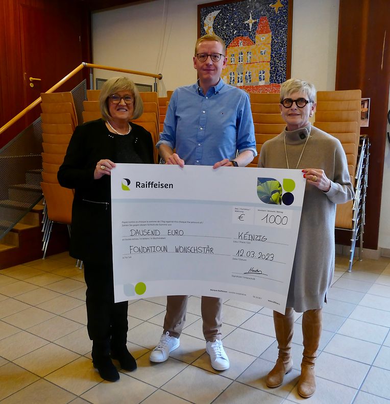 Ein letzter wichtiger Punkt war die Überreichung eines Schecks von 1000€ an Frau Vermeer der Fondation Wonschstär. Der Erlass der Kollekte des am 26. November gespielte spirituelle Konzert vom Blechensemble der Harmonie in der Küntziger Kirche und einer zusätzlichen Spende des Vereins wurde an die Fondation überreicht.