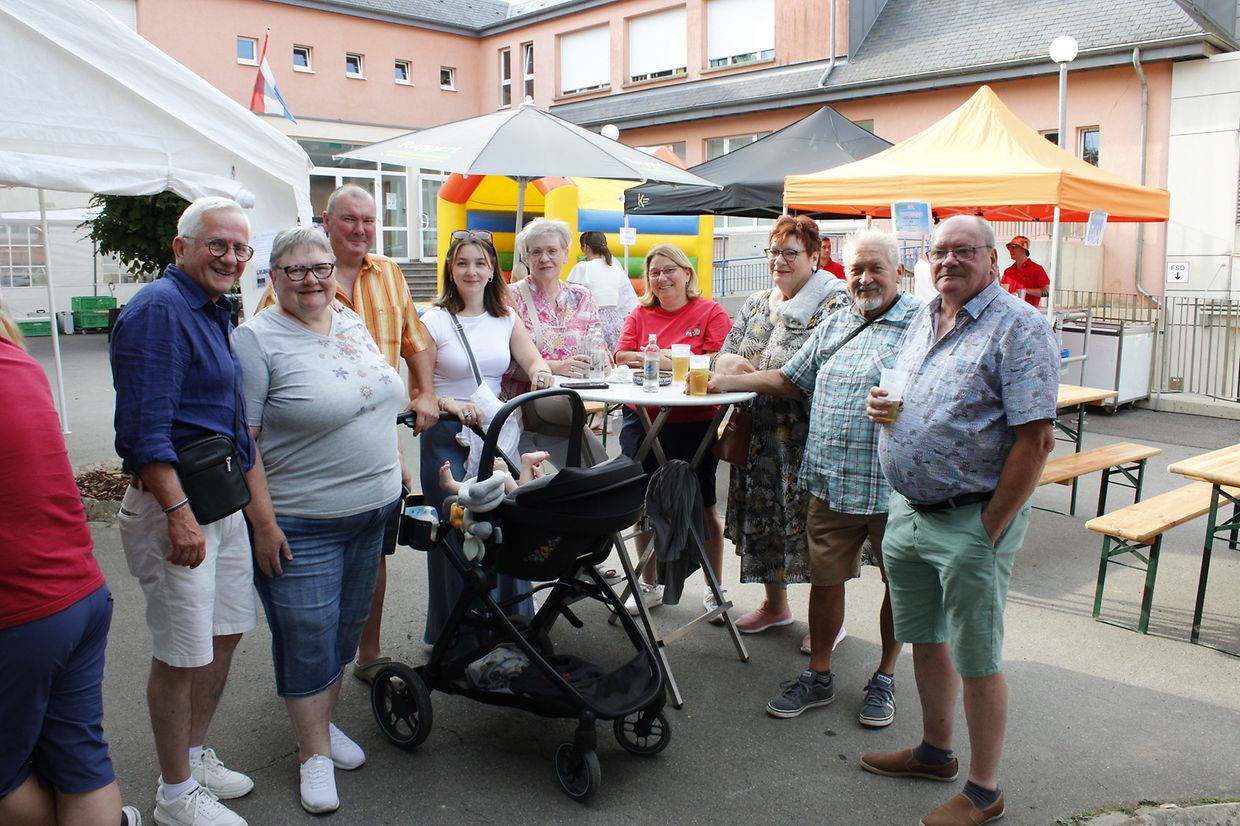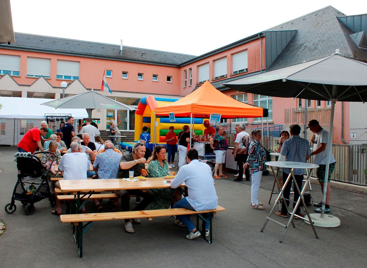Für das passende Urlaubsfeeling sorgte eine stilvoll eingerichtete Cocktailbar, an der es fruchtige Drinks und erfrischende Kreationen gab. Der Samstag stand ganz im Zeichen von Musik, Geselligkeit und regionalem Genuss. Bereits ab 16:00 Uhr füllte sich der Festplatz erneut mit gut gelaunten Besucherinnen und Besuchern. Um 18:00 Uhr übernahm die „Kanecher Musek” die musikalische Bühne und begeisterte mit einem abwechslungsreichen Repertoire aus traditionellen und modernen Stücken. Ihre Darbietung wurde mit viel Applaus honoriert und trug zur gemütlichen Atmosphäre des frühen Abends bei. Ab 20 Uhr sorgte Stimmungsmacher Rol Girres mit mitreißender Party- und Tanzmusik für beste Laune – ob Disco, Schlager oder Klassiker zum Mitsingen: Schnell war die Tanzfläche gefüllt und der Schulhof wurde zur Open-Air-Party.