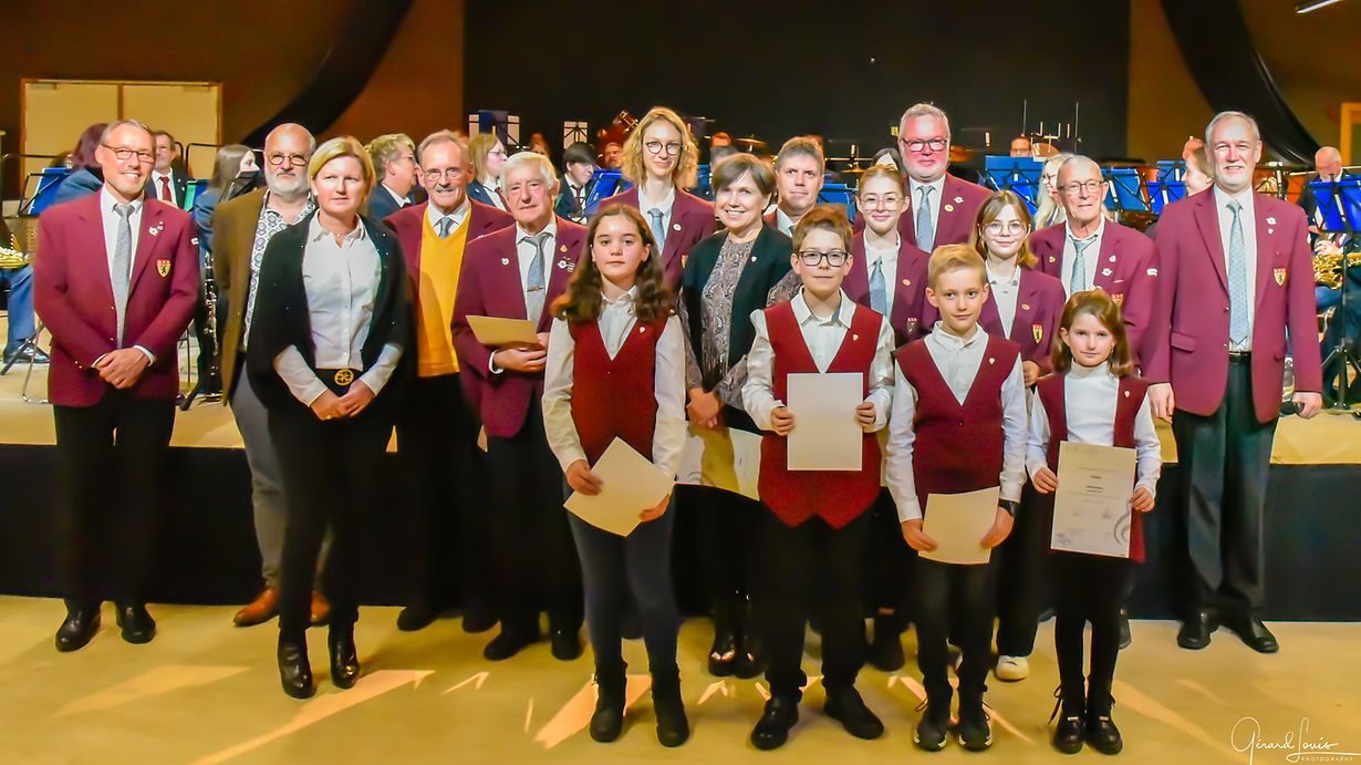 Eng Insigne fir 5 Joer Musek kruten : Mara Bisenius, Flütt ; Loïc Christnach, Trombone ; Mauro Hengen, Trompett ; Liséa Schlenker, Klarinett ; Karin Beil an Thérèse Van Dyck, Jugend Kommissioun. Eng Médaille de mérite en bronze fir 10 Joer Musek kruten : Lucy Chrisnach an Lizi Roth, Klarinett; Marie Urwald, Flütt; Hélène Stelandre, Cor an Dirigentin; Guy Grosber, Animateur. Eng Médaille de mérite en argent fir 20 Joer Musek kruten : Martine Hermes, Klarinett an Anne Schwartz, Flütt. Eng Médaille de mérite en vermeil avec palmette fir 40 Joer Musek kruten : Denis Heirens, Trombone an Fränk Fonck, Trombone an Sous-Chef. Eng Médaille en vermeil Grand-Duc Adolphe fir 60 Joer Musek krut de Roland Anen, Euphonium. Eng Médaille en vermeil Grand-Duc Adolphe avec palmette fir 70 Joer Musek kruten : Roger Hintgen, Trompett an Niki Welter, Bass Klarinett