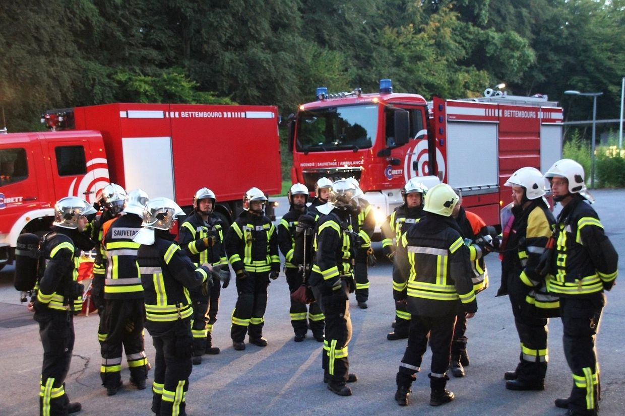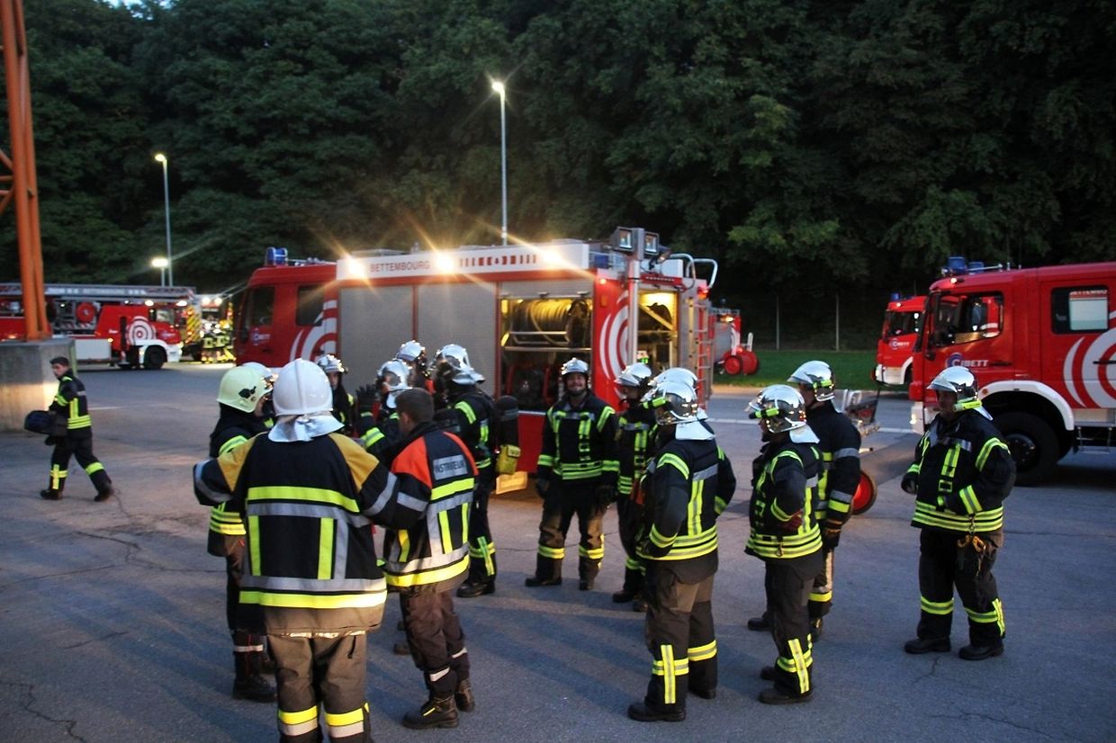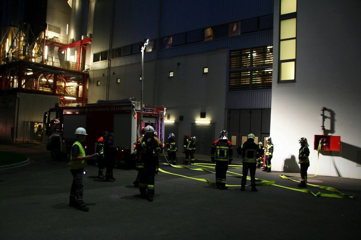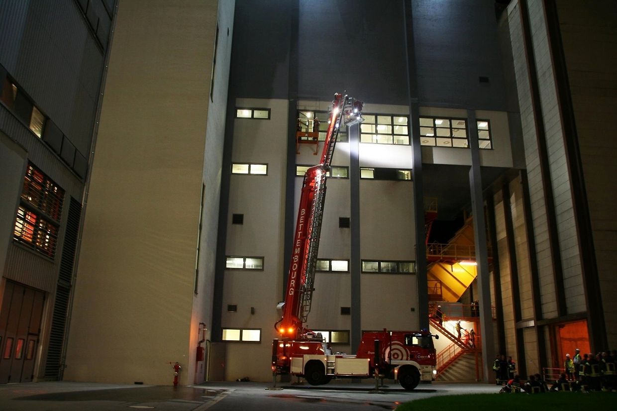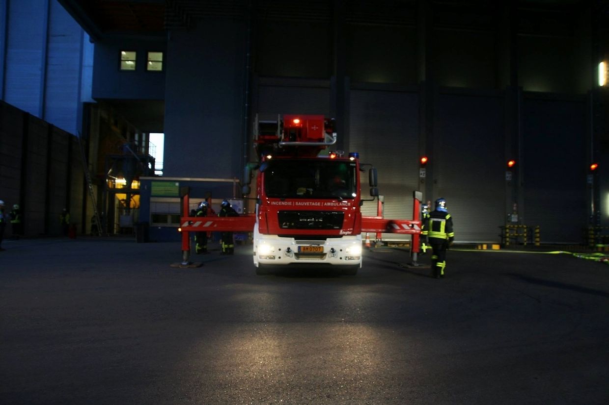 Gegen 19:40 Uhr wurden die Feuerwehren aus Leudelingen und Bettemburg gleichzeitig mit der Meldung „AG Feier – SIDOR Leudelange – Brand im Müllbunker“ alarmiert. Die Feuerwehr Leudelingen, welche als Erster vor Ort war, übernahm die erste Erkundung mit Hilfe der am Eingang bereitgestellten Notfallplänen des Betriebs. Schnell war klar dass es sich hierbei um keinen gewöhnlichen Einsatz handeln würde: Das Treppenhaus war auf Grund des Brandes bis auf eine Höhe von 23m vollständig verraucht, 3 Personen wurden vermisst, weitere Arbeiter waren im Kontrollzentrum vom Rauch eingeschlossen worden. Unter schwerem Atemschutz drangen die Einsatzkräfte in den verrauchten Bereich vor, um nach möglichen Opfern zu suchen. Diese konnten sehr schnell im Treppenhaus, sowie im oberen Bereich des Müllbunkers lokalisiert werden. Ein weiteres Opfer war in den Bunker gestürzt und befand sich in etwa 10m Tiefe. Der Atemschutztrupp lokalisierte die Arbeiter des Kontrollzentrums. Da diese aber zum aktuellen Zeitpunkt nicht in unmittelbarer Gefahr waren, hatten die verletzten Arbeiter Vorrang. Während die Rettung der beiden erstgenannten Opfer schnell durch Atemschutztrupps über das Treppenhaus erfolgen konnte, gestaltete sich die Rettung des abgestürzten Arbeiter komplizierter. Mit Hilfe des Teleskopmastfahrzeuges der Feuerwehr Bettemburg wurde ein mit schwerem Atemschutz ausgerüsteter Feuerwehrmann zu dem Verunfallten abgeseilt. Das Opfer wurde in einer Korbschleiftrage fixiert und mittels mehreren Sicherheitsleinen von den Einsatzkräften aus dem Bereich gerettet. Dabei galt es sowohl das Opfer wie auch alle beteiligten Einsatzkräfte während der gesamten Arbeitsdauer im Gefahrenbereich zu sichern.